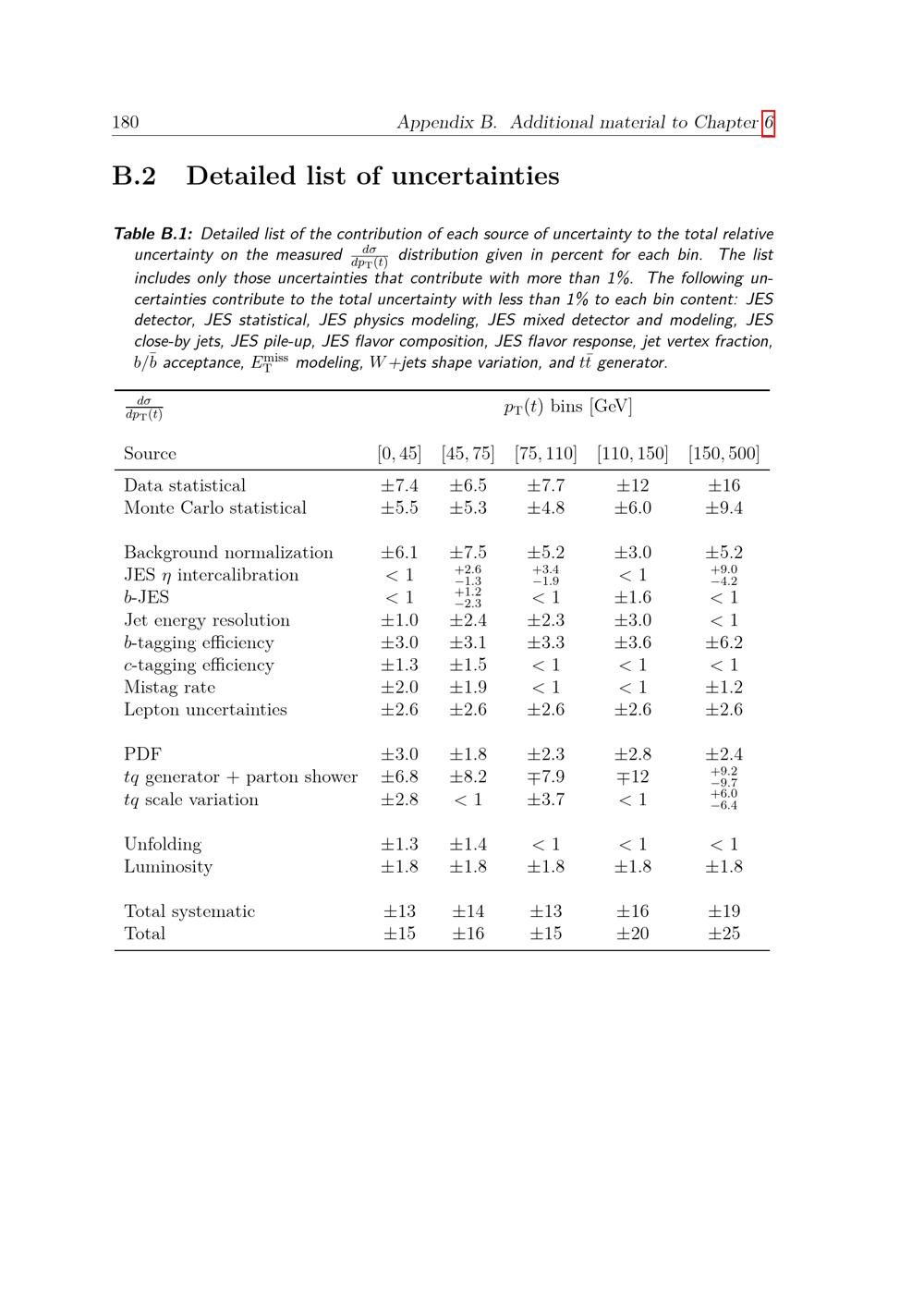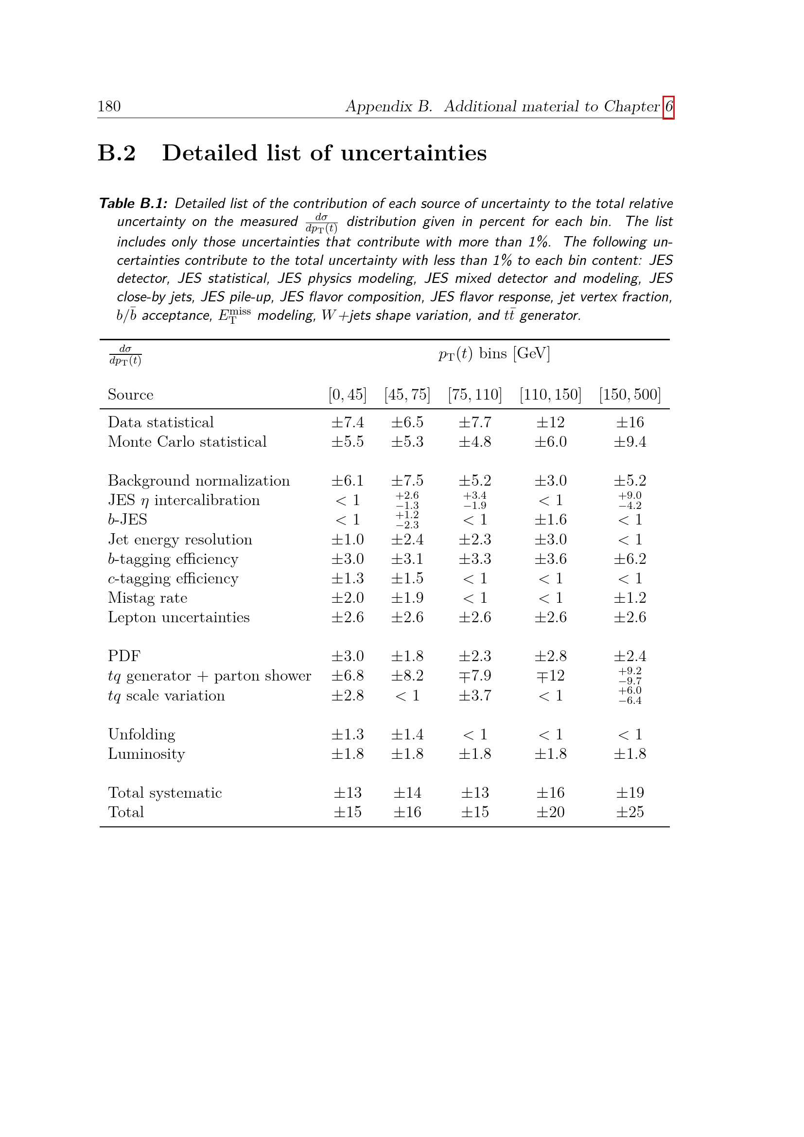 Detailed list of uncertainties