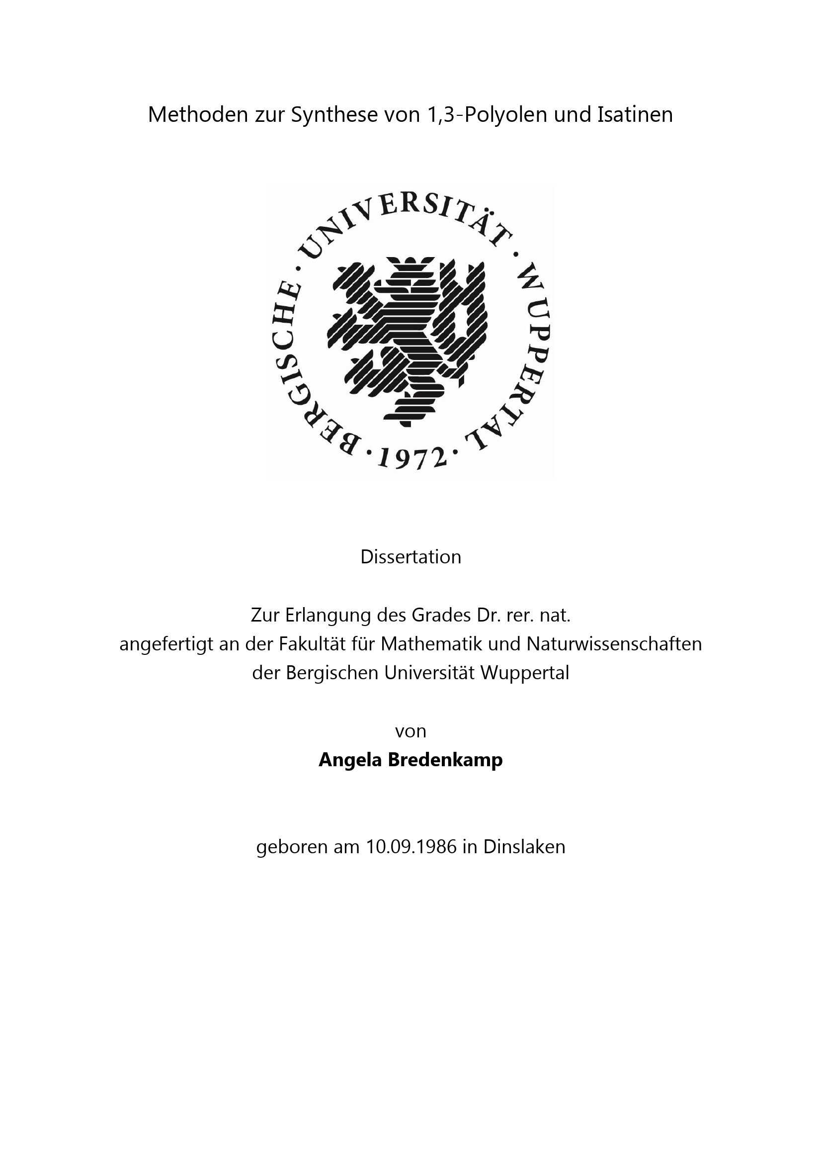 Methoden zur Synthese von 1,3-Polyolen und Isatinen / von Angela Bredenkamp