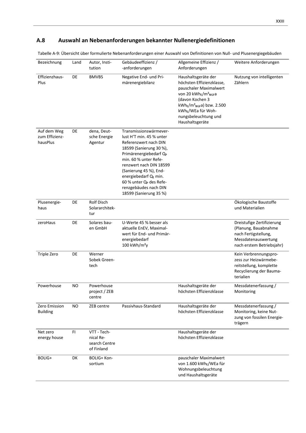 A.8 Auswahl an Nebenanforderungen bekannter Nullenergiedefinitionen