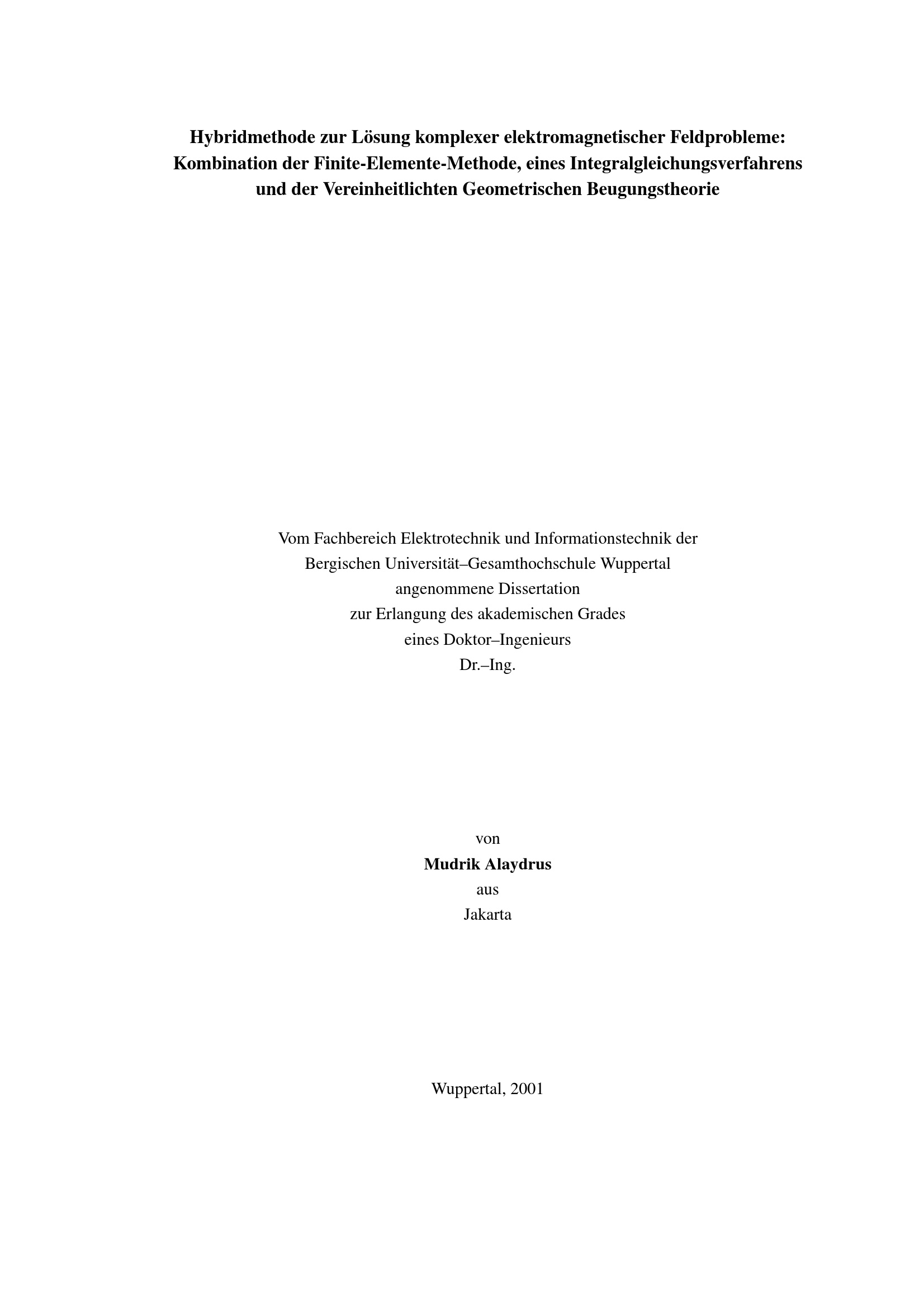Hybridmethode zur Lösung komplexer elektromagnetischer Feldprobleme : Kombination der Finite-Elemente-Methode, eines Integralgleichungsverfahrens und der Vereinheitlichten Geometrischen Beugungstheorie / von Mudrik Alaydrus