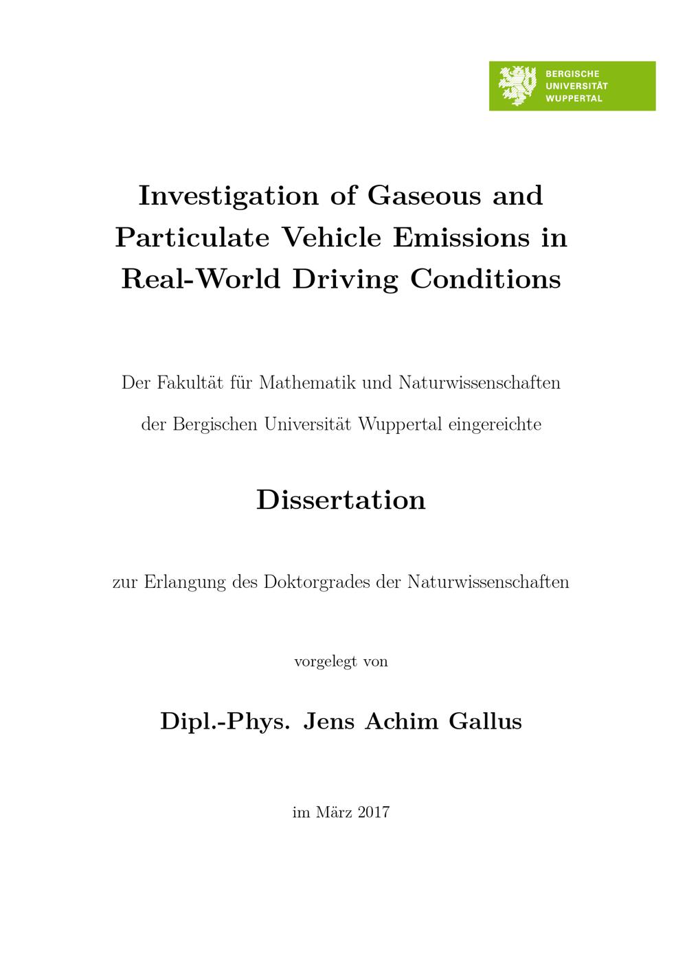 Investigation of gaseous and particulate vehicle emissions in real-world driving conditions / vorgelegt von Dipl.-Phys. Jens Achim Gallus