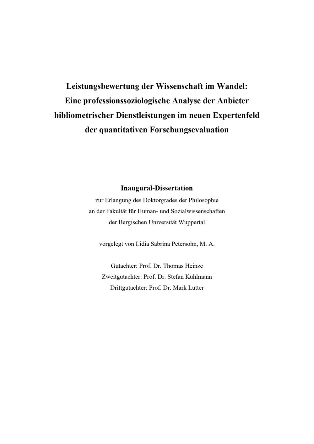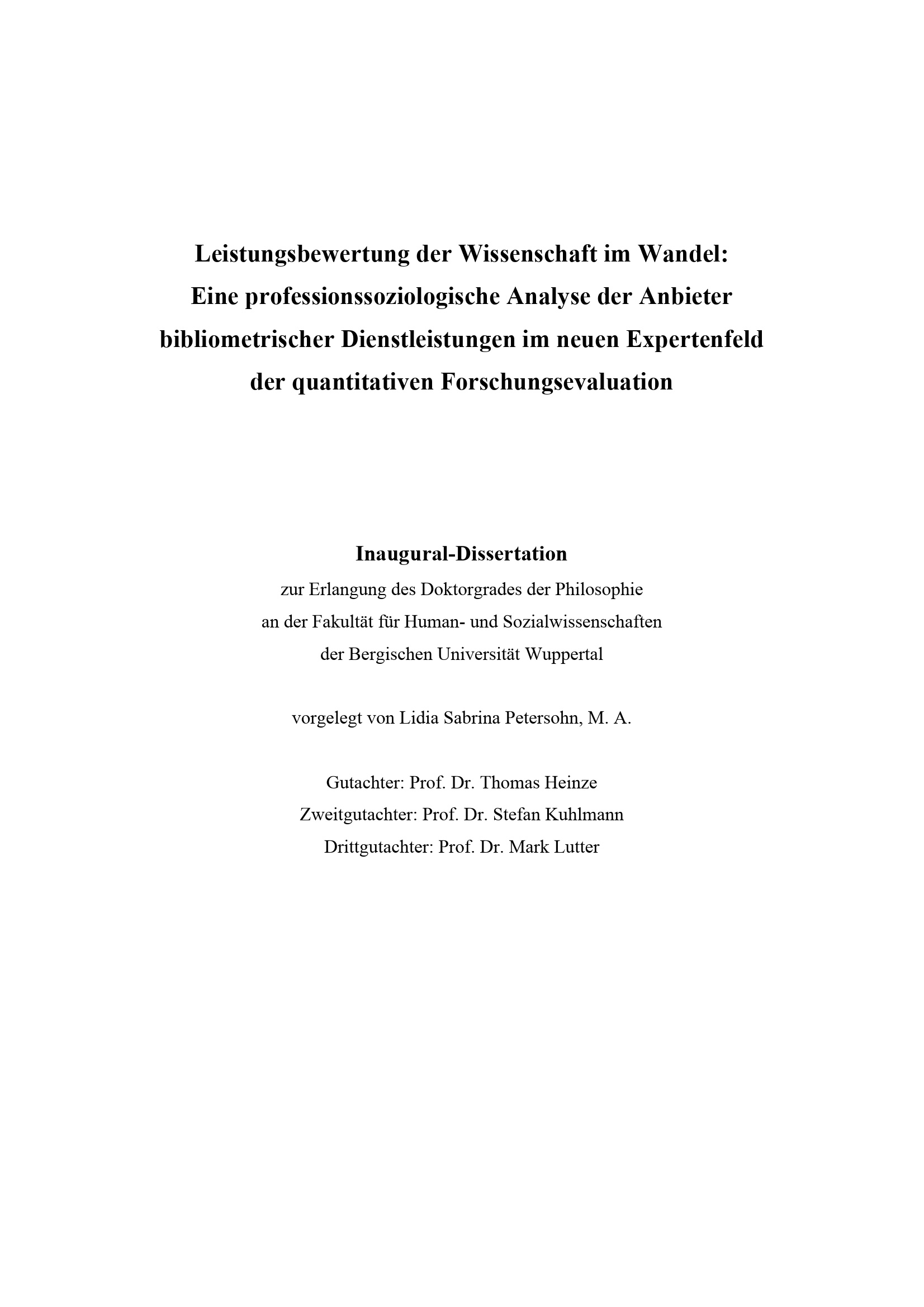 Leistungsbewertung der Wissenschaft im Wandel : eine professionssoziologische Analyse der Anbieter bibliometrischer Dienstleistungen im neuen Expertenfeld der quantitativen Forschungsevaluation / vorgelegt von Lidia Sabrina Petersohn, M.A.