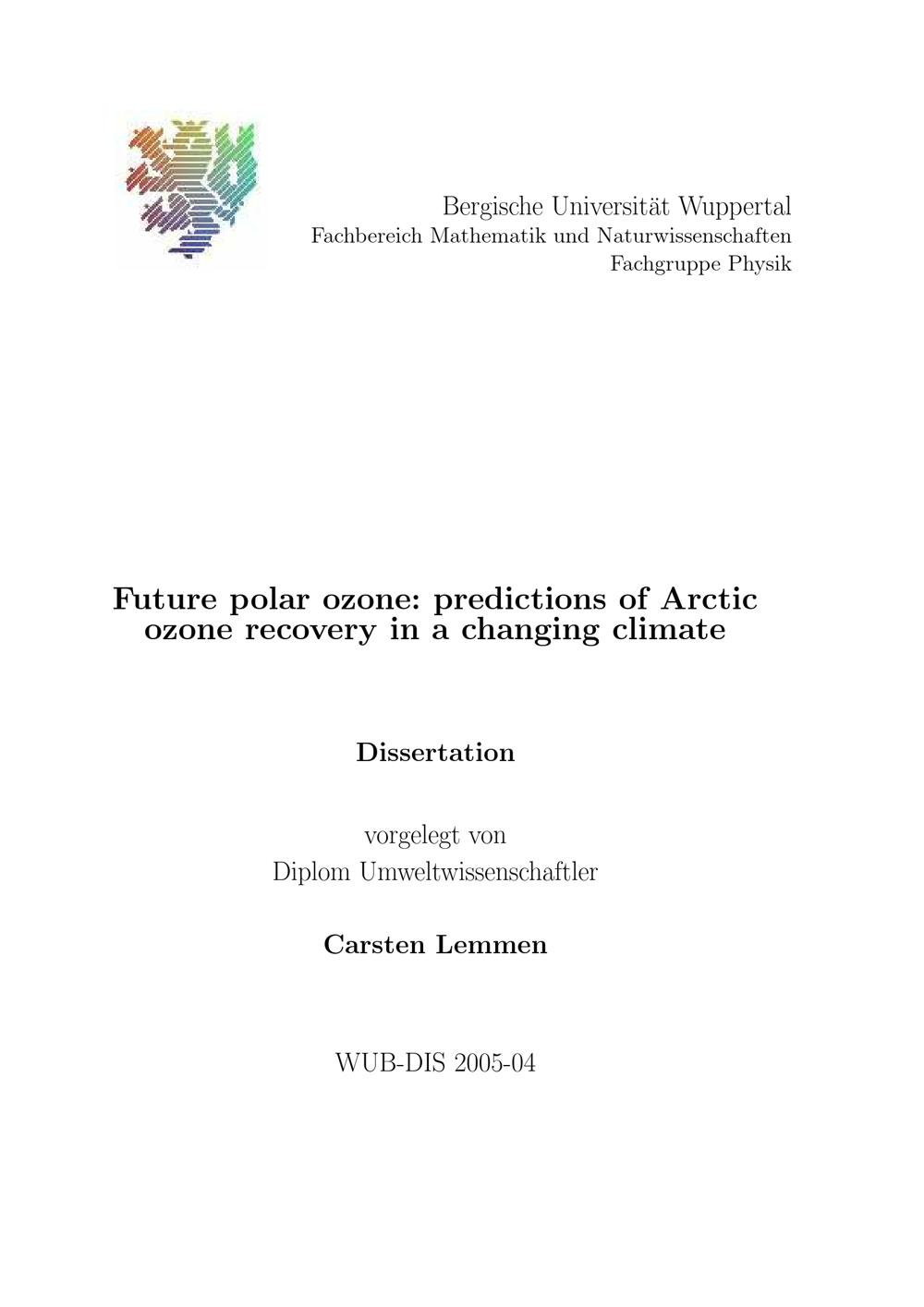 Future polar ozone : predictions of Arctic ozone recovery in a changing climate / vorgelegt von Carsten Lemmen