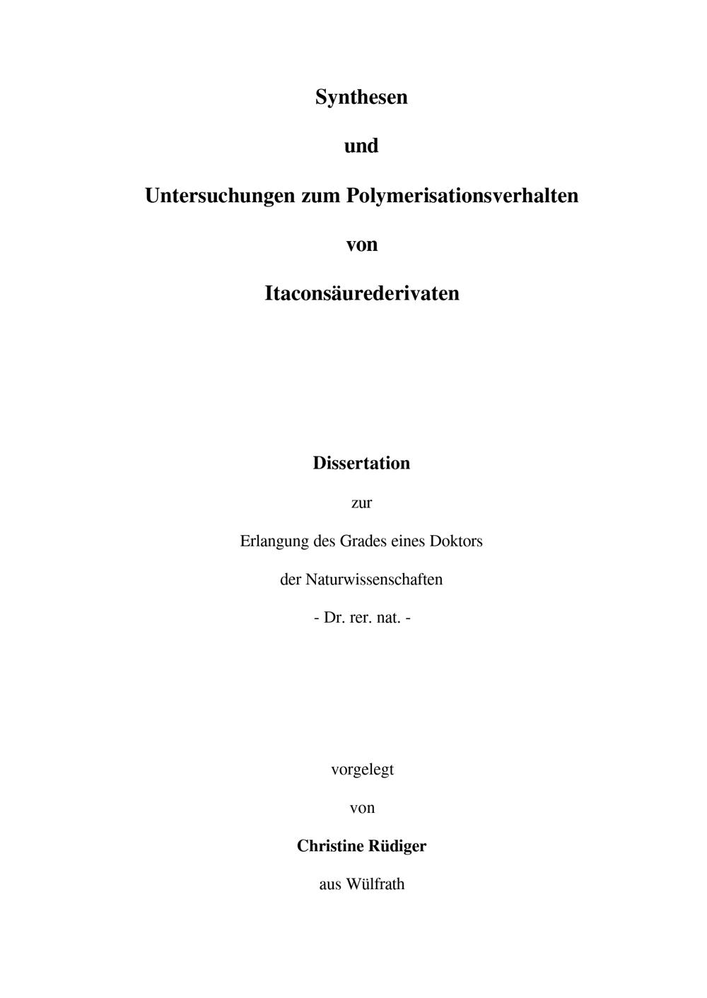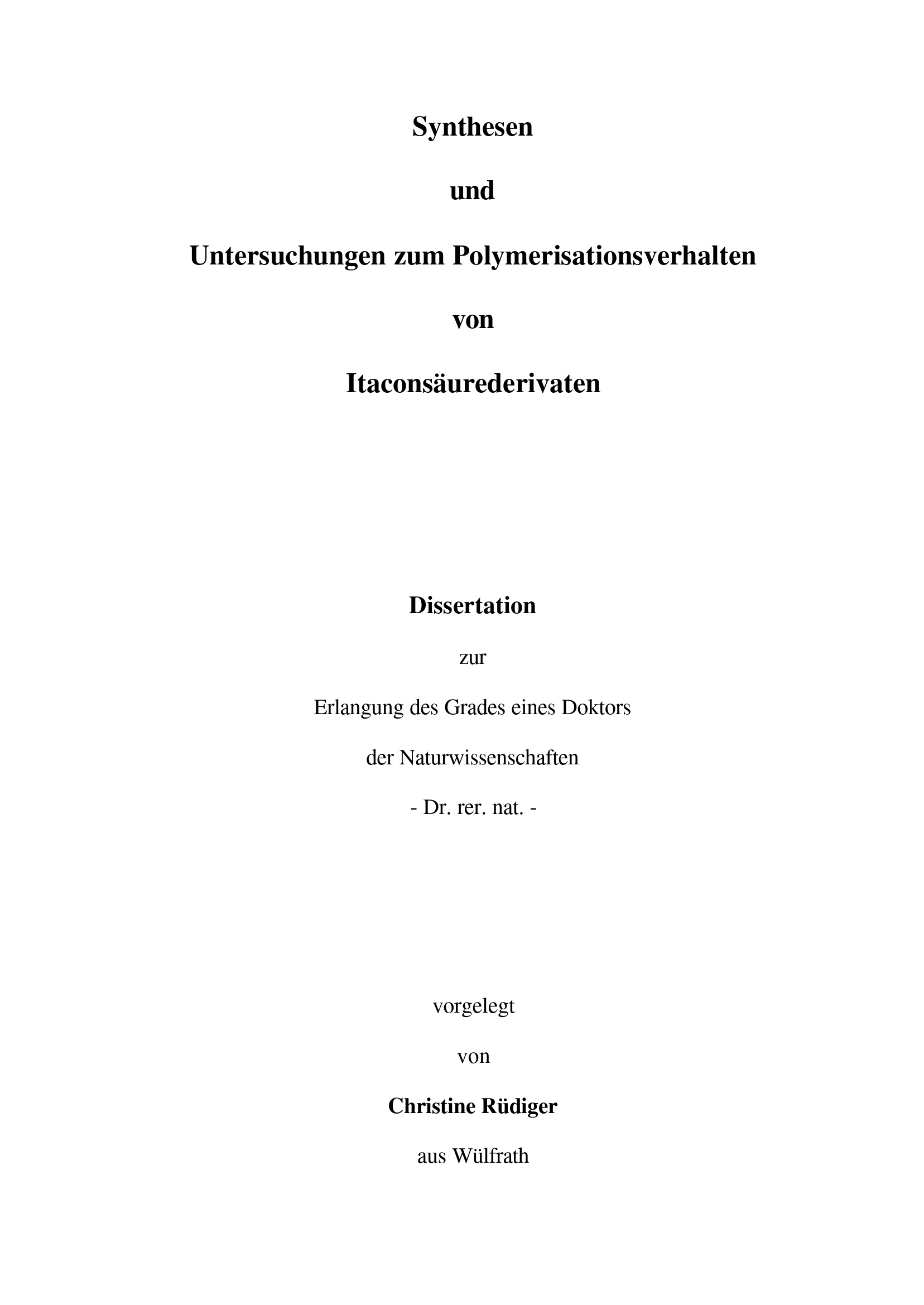 Synthesen und Untersuchungen zum Polymerisationsverhalten von Itaconsäurederivaten / vorgelegt von Christine Rüdiger