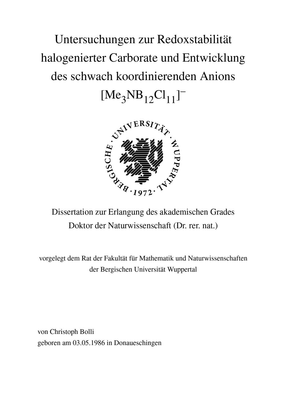 Untersuchungen zur Redoxstabilität halogenierter Carborate und Entwicklung des schwach koordinierenden Anions [Me 3 NB 12 Cl 11] - / von Christoph Bolli