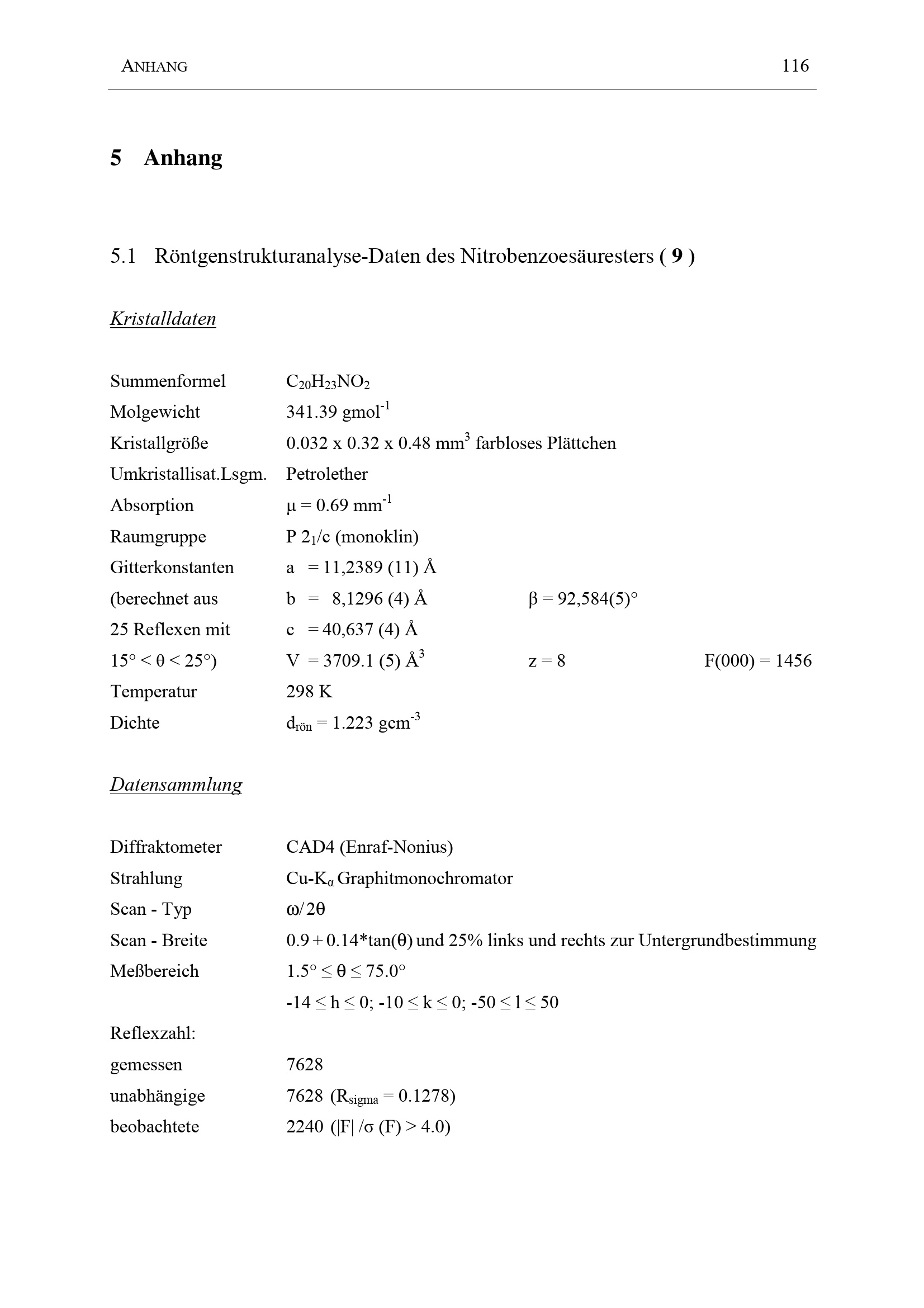 Röntgenstrukturanalyse-Daten des Nitrobenzoesäuresters (9)