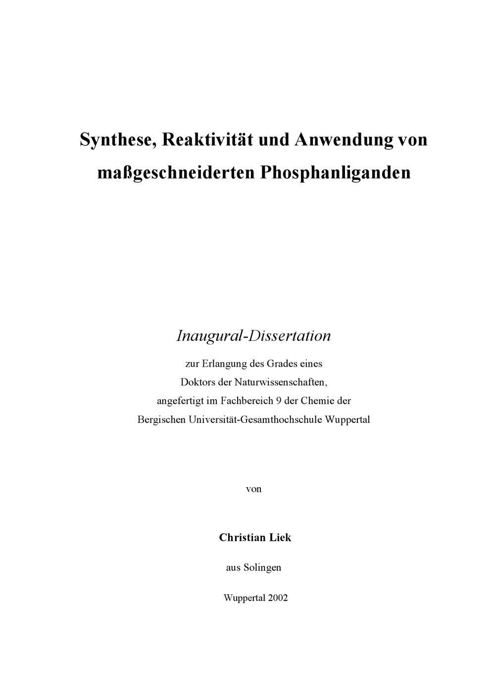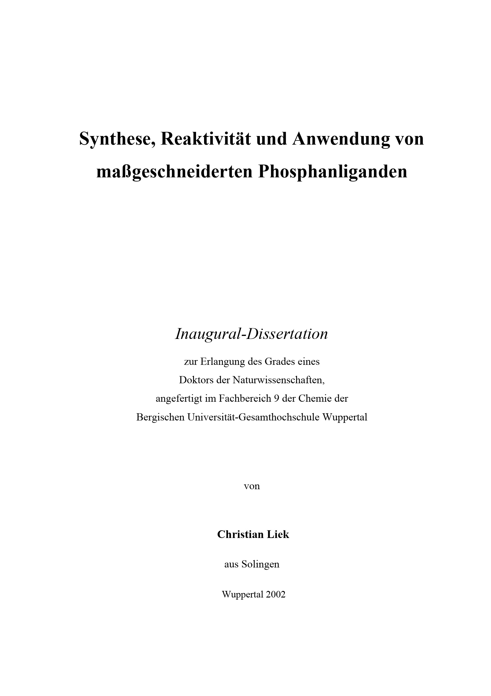 Synthese, Reaktivität und Anwendung von maßgeschneiderten Phosphanliganden / angefertigt von Christian Liek