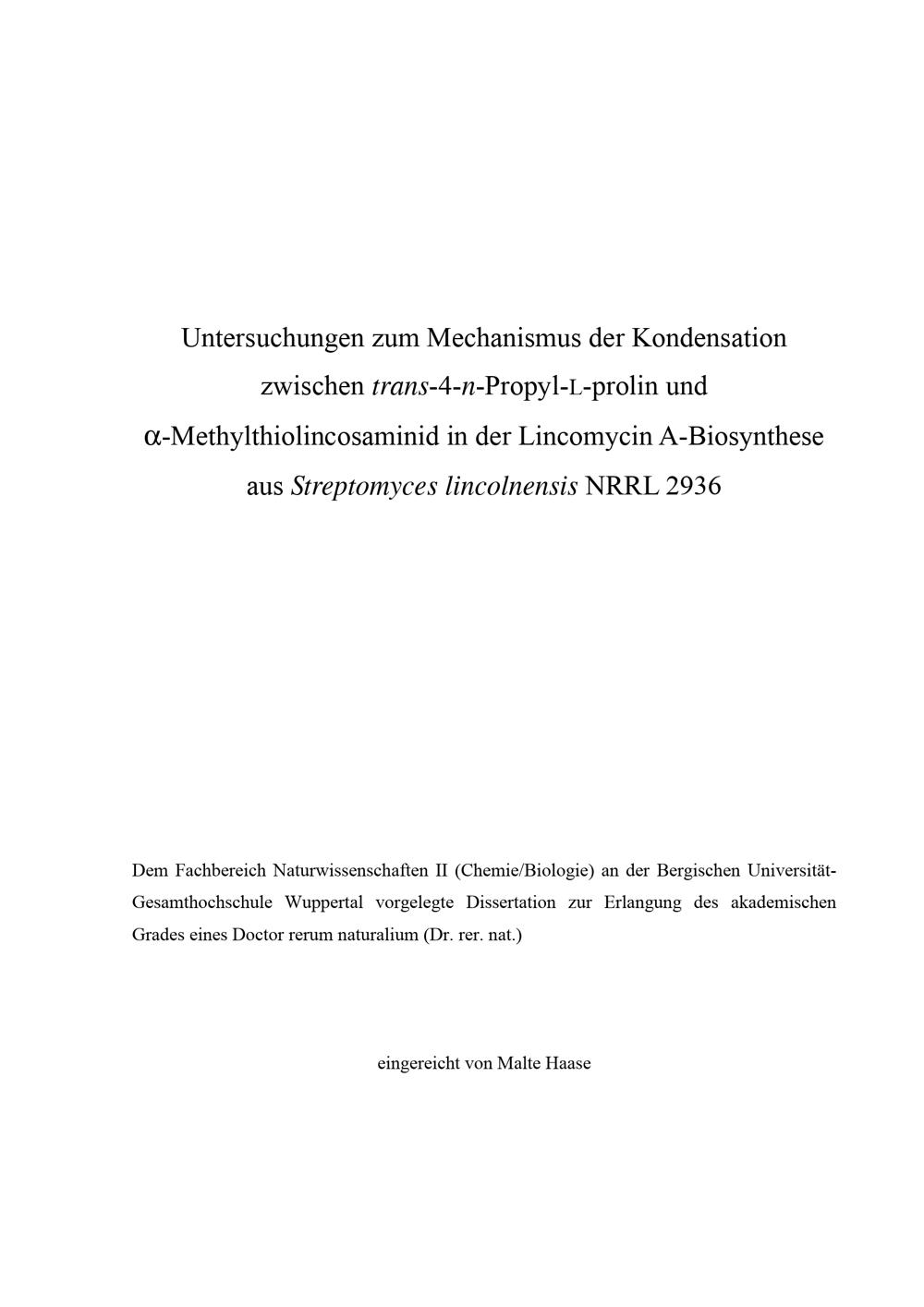 Untersuchungen zum Mechanismus der Kondensation zwischen trans-4-n-Propyl-L-prolin und alpha-Methylthiolincosaminid in der Lincomycin-A-Biosynthese aus Streptomyces lincolnensis NRRL 2936 / eingereicht von Malte Haase