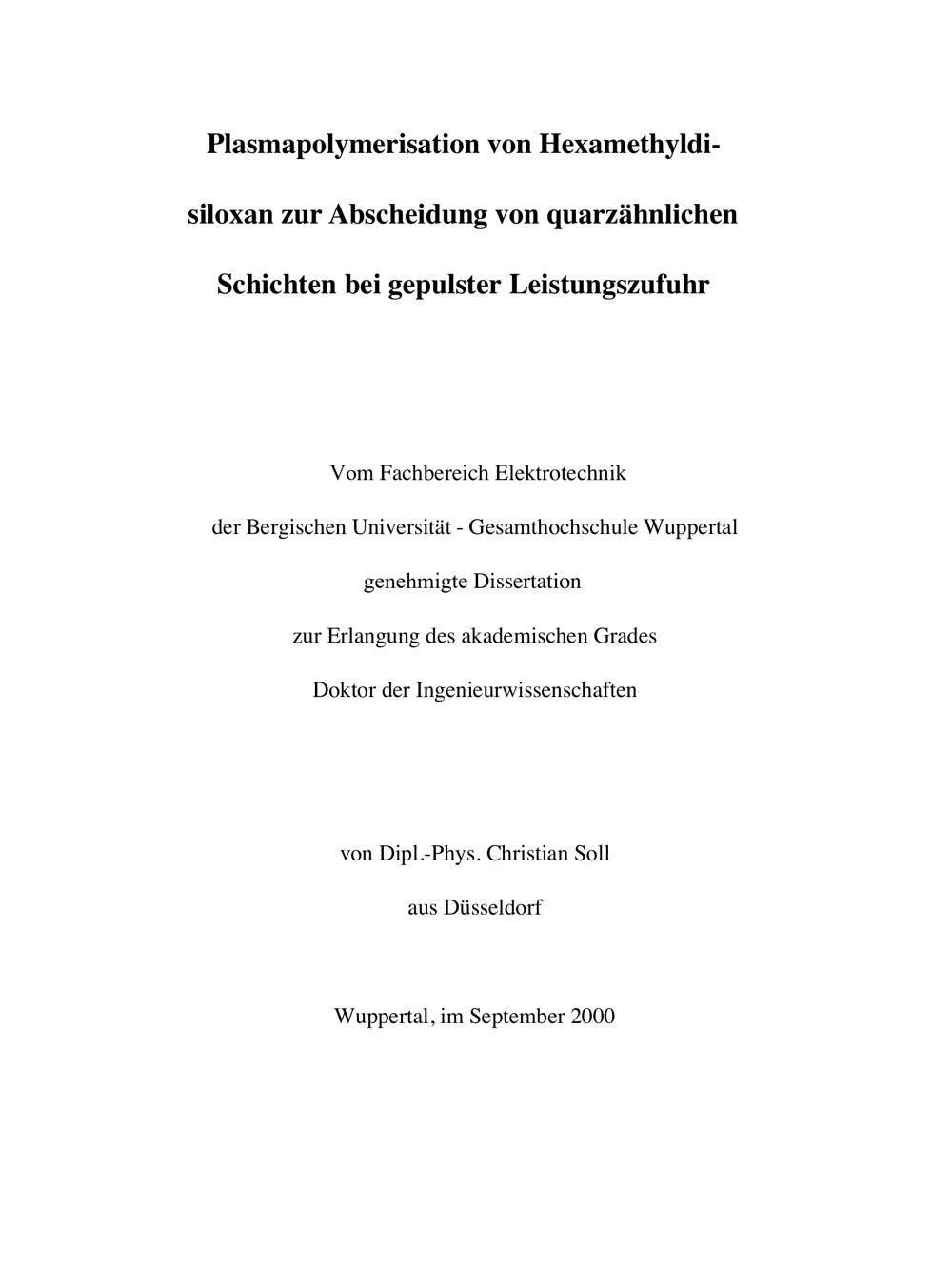 Plasmapolymerisation von Hexamethyldisiloxan zur Abscheidung von quarzähnlichen Schichten bei gepulster Leistungszufuhr / von Christian Soll