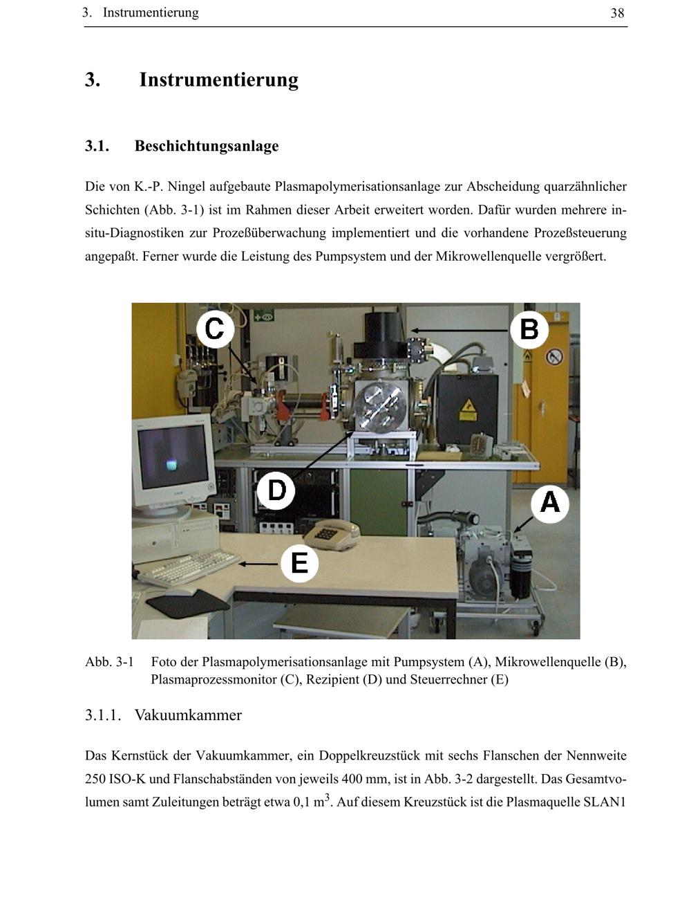 Abb. 3-1 Foto der Plasmapolymerisationsanlage mit Pumpsystem (A), Mikrowellenquelle[...]