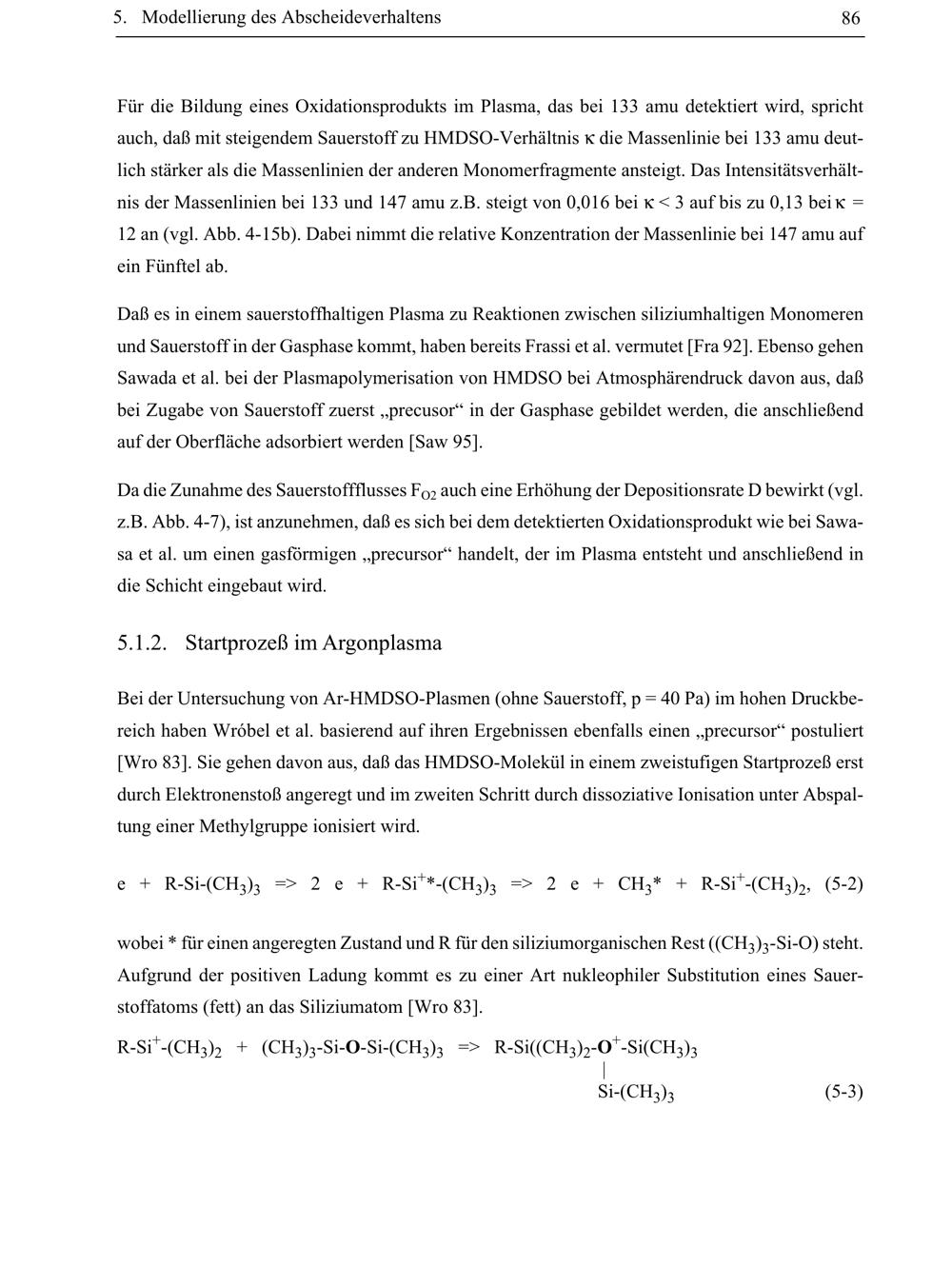 e + R-Si-(CH3)3 => 2 e + R-Si+*-(CH3)3 => 2 e + CH3* + R-Si+-(CH3)2, (5-2)