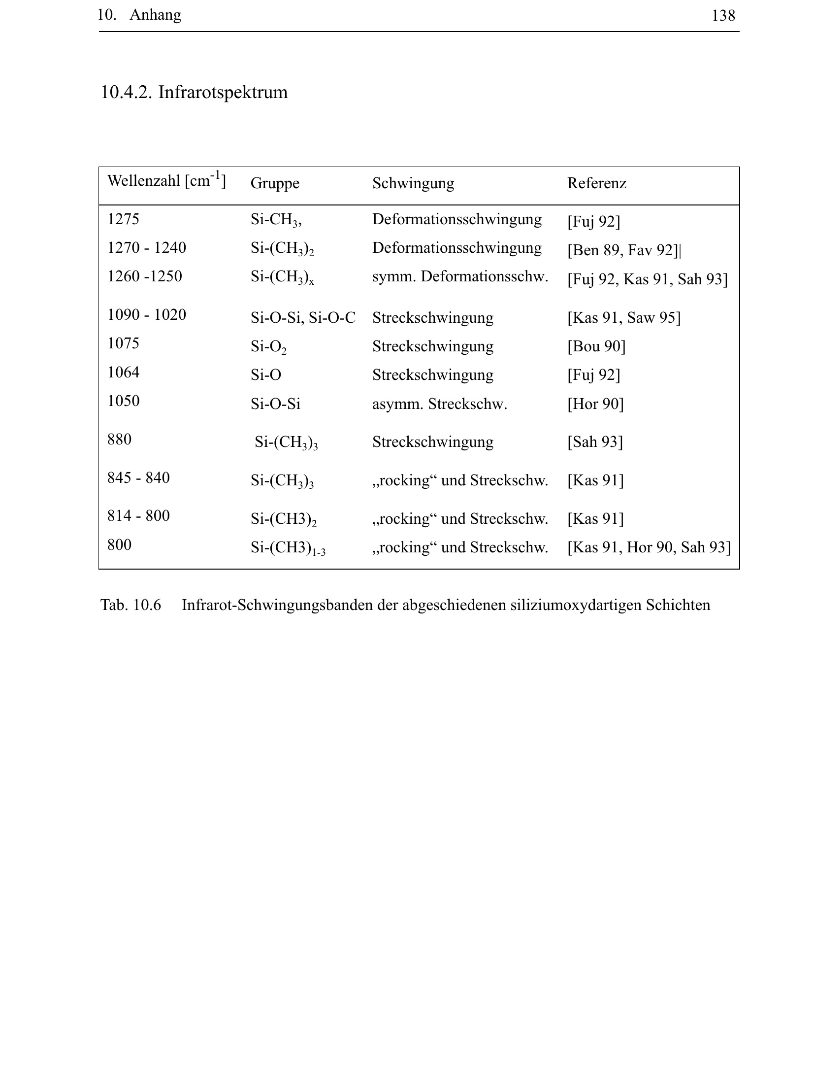 Tab. 10.6 Infrarot-Schwingungsbanden der abgeschiedenen siliziumoxydartigen Schi[...]