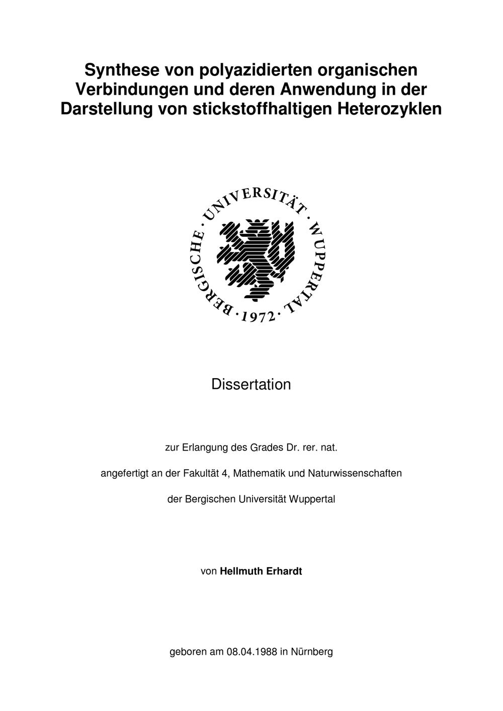 Synthese von polyazidierten organischen Verbindungen und deren Anwendung in der Darstellung von stickstoffhaltigen Heterozyklen / von Hellmuth Erhardt, geboren in Nürnberg