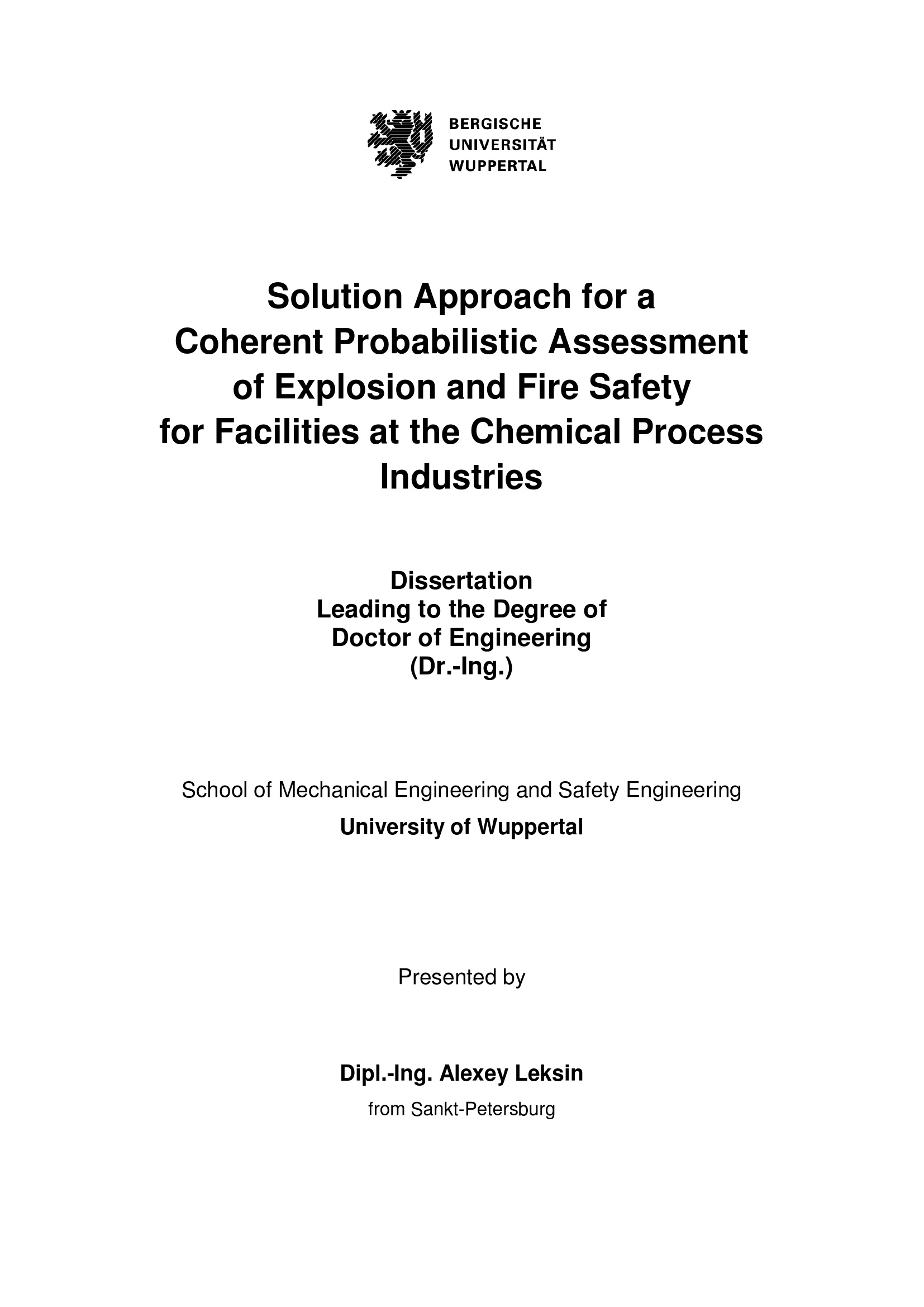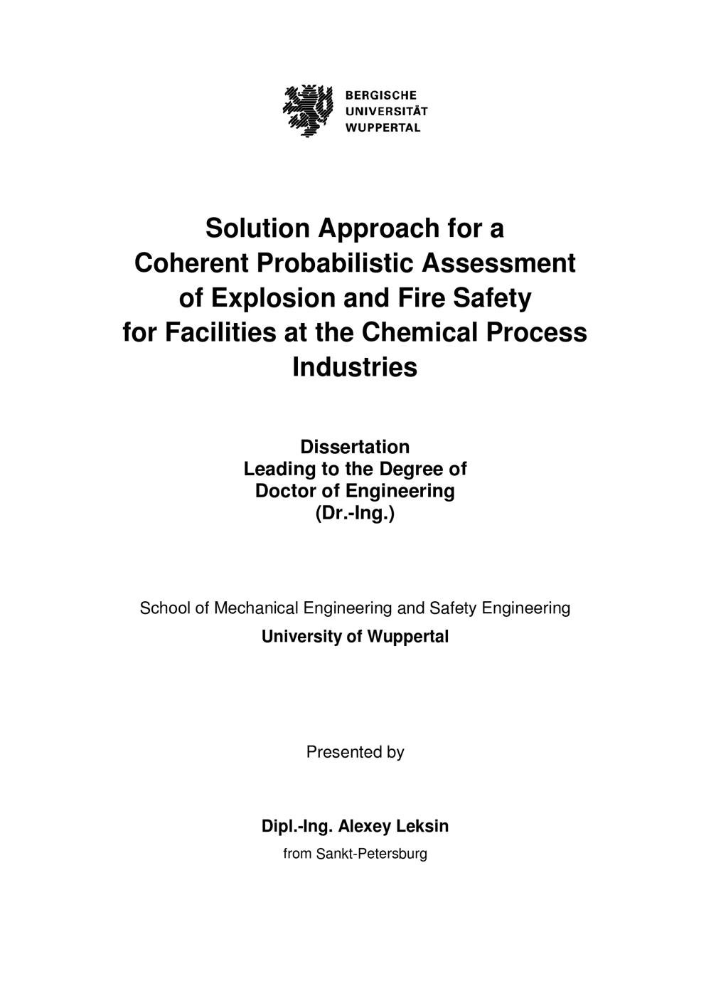 Solution approach for a coherent probabilistic assessment of explosion and fire safety for facilities at the chemical process industries / presented by Dipl.-Ing. Alexey Leksin from Sankt-Petersburg