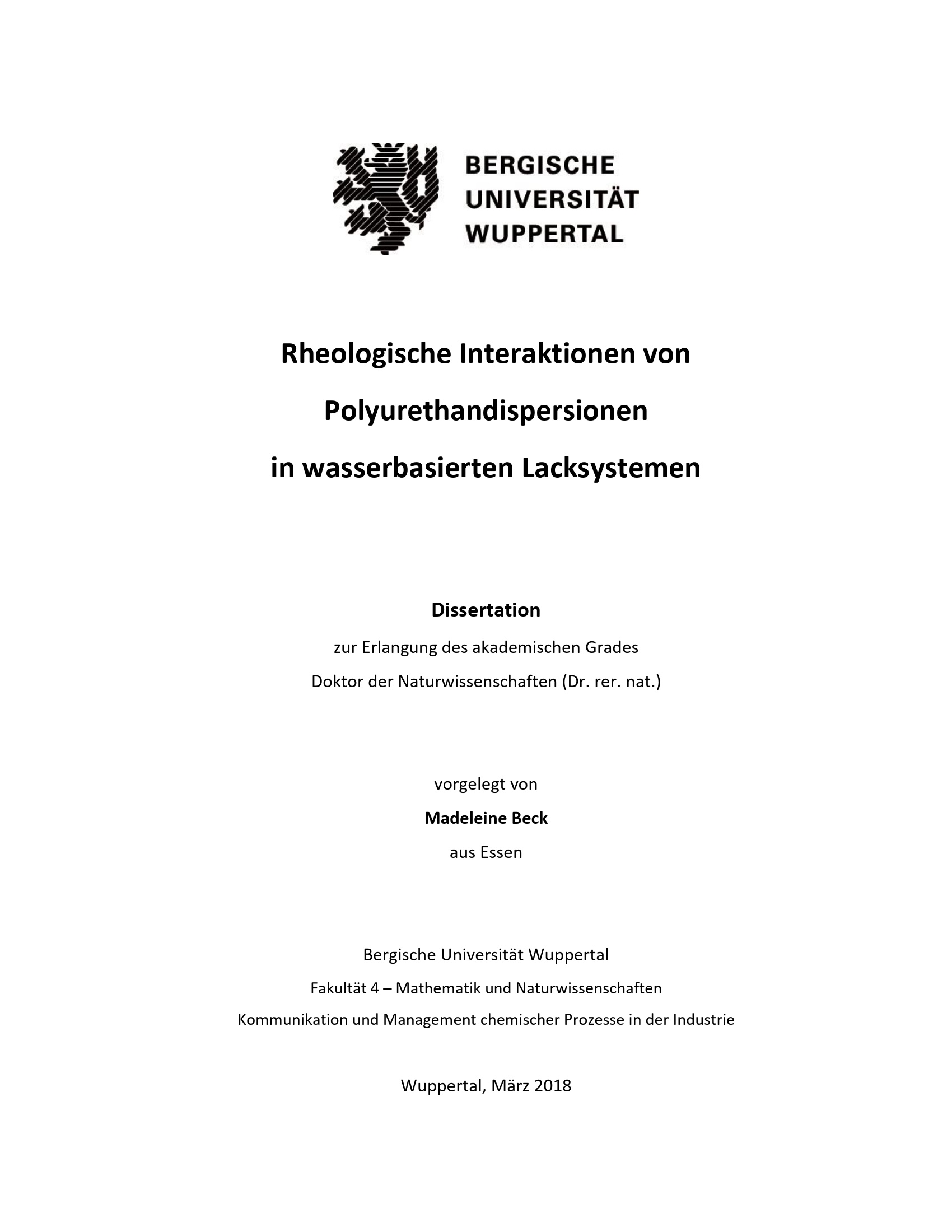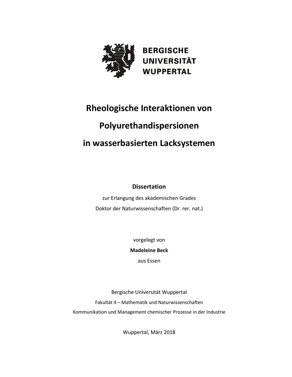 Rheologische Interaktionen von Polyurethandispersionen in wasserbasierten Lacksystemen / vorgelegt von Madeleine Beck aus Essen
