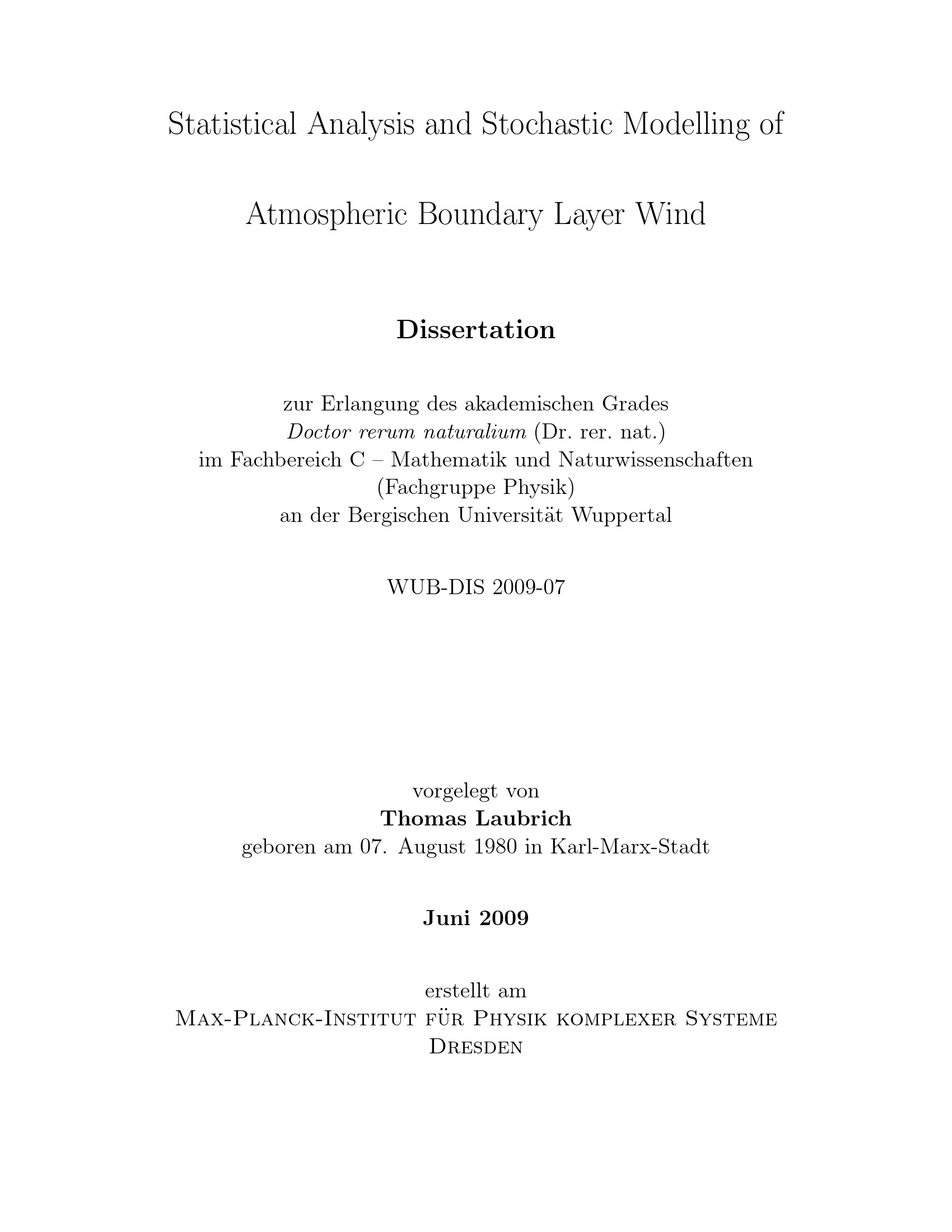 Statistical analysis and stochastic modelling of atmospheric boundary layer wind / vorgelegt von Thomas Laubrich