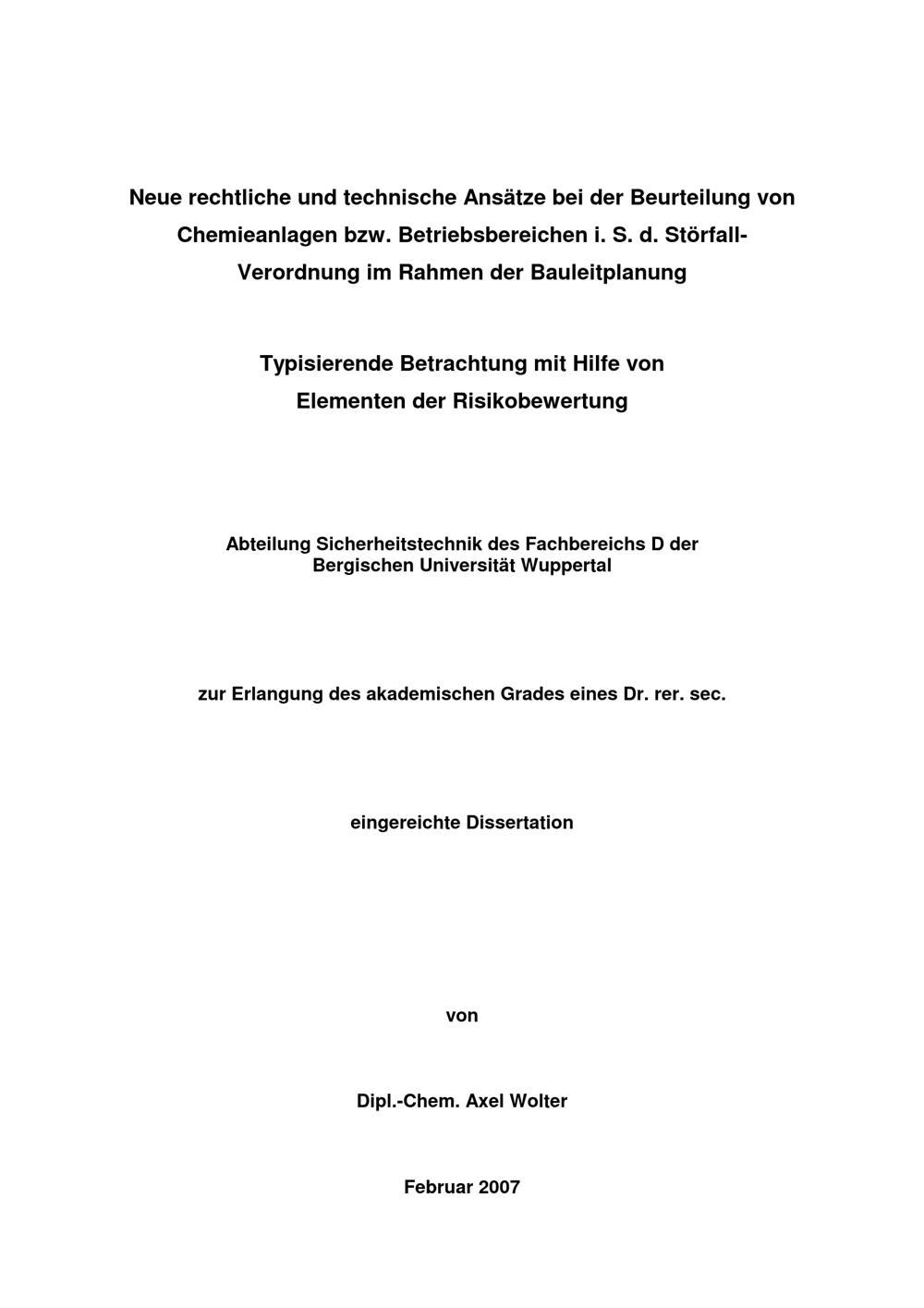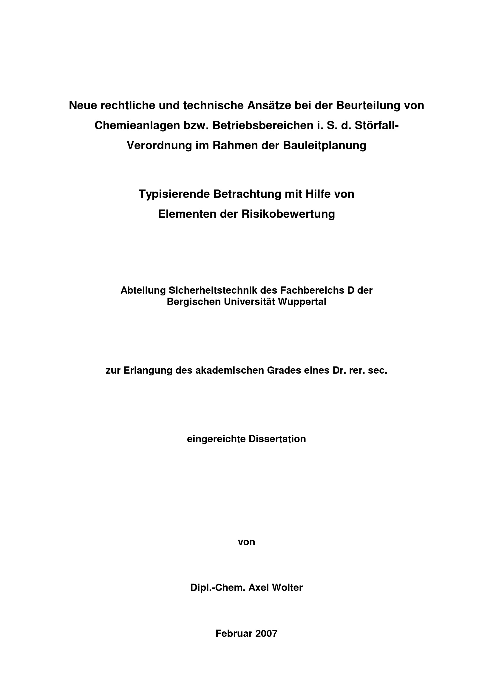 Neue rechtliche und technische Ansätze bei der Beurteilung von Chemieanlagen bzw. Betriebsbereichen i.S.d. Störfall-Verordnung im Rahmen der Bauleitplanung : typisierende Betrachtung mit Hilfe von Elementen der Risikobewertung / von Axel Wolter