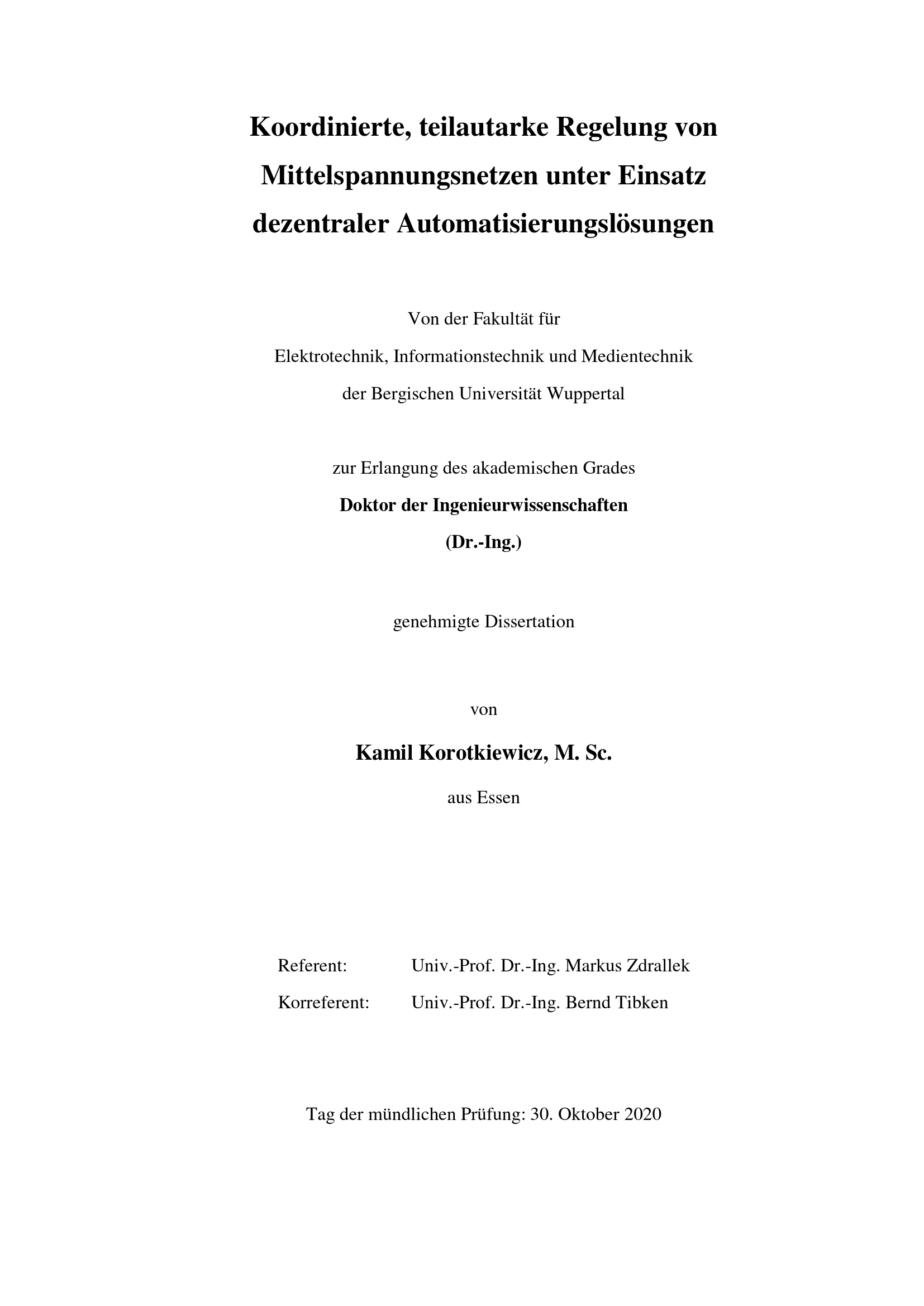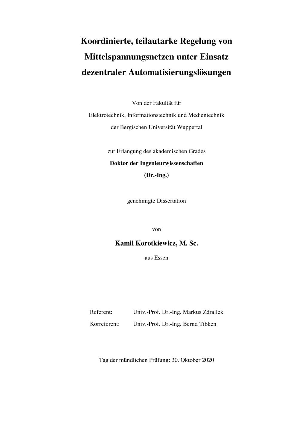 Koordinierte, teilautarke Regelung von Mittelspannungsnetzen unter Einsatz dezentraler Automatisierungslösungen / von Kamil Korotkiewicz, M. Sc. aus Essen