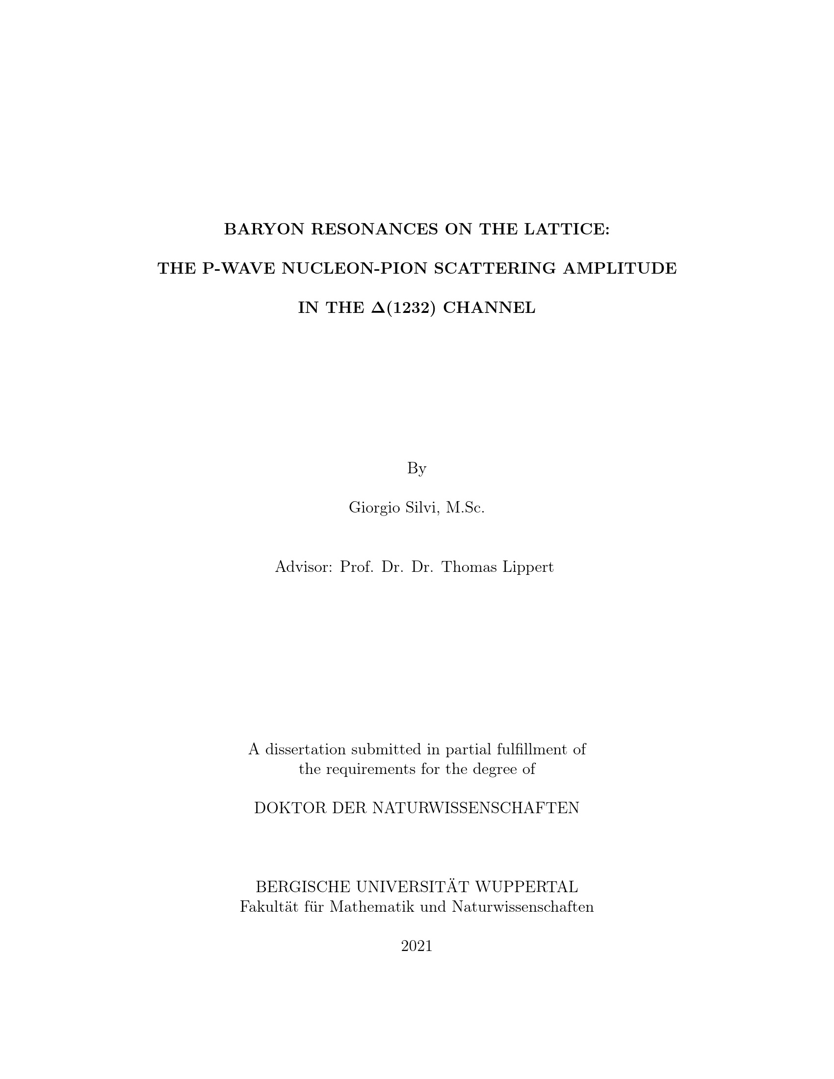 Baryon resonances on the lattice : the P-wave nucleon-pion scattering amplitude in the Δ (1232) channel / by Gorgio Silvi, M.Sc.