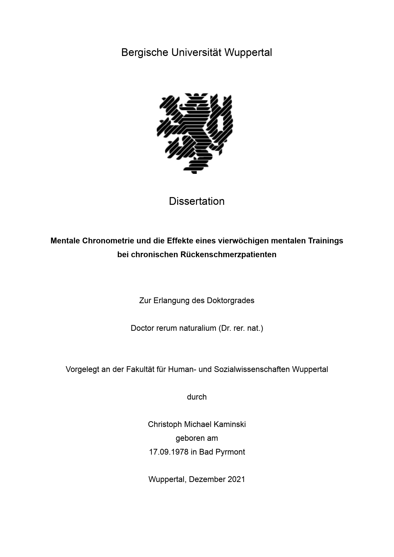 Mentale Chronometrie und die Effekte eines vierwöchigen mentalen Trainings bei chronischen Rückenschmerzpatienten / Christoph Michael Kaminski