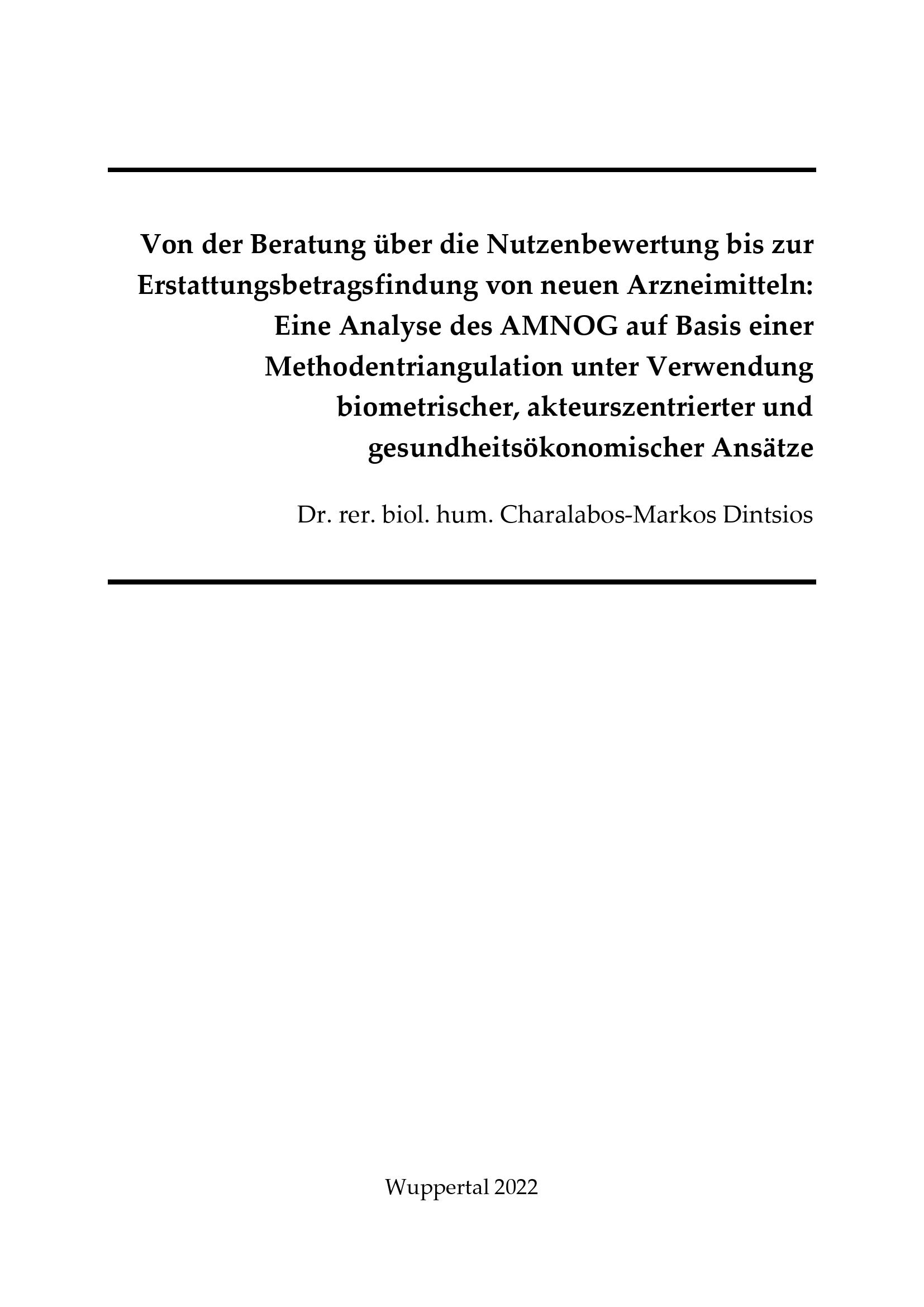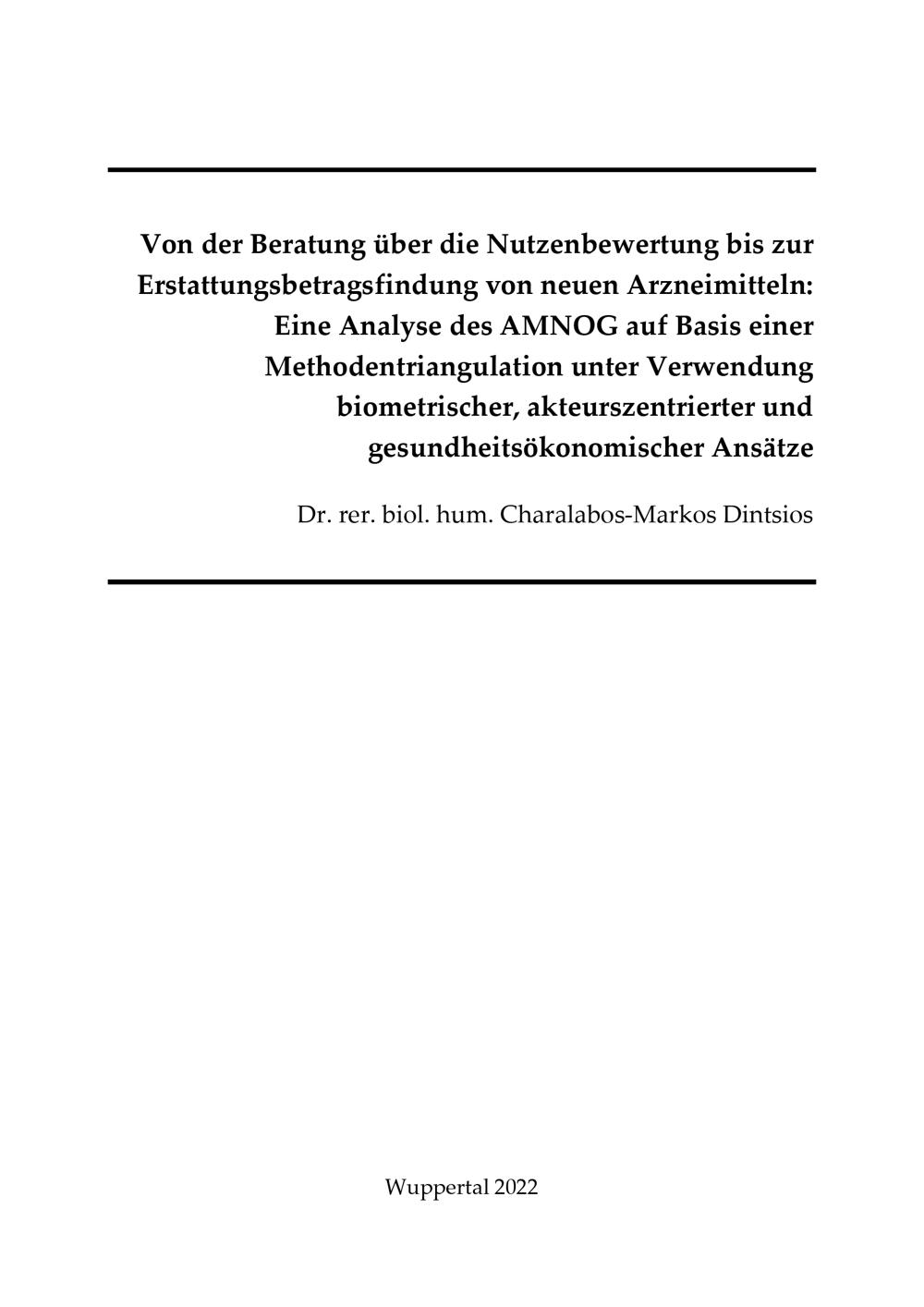 Von der Beratung über die Nutzenbewertung bis zur Erstattungsbetragsfindung von neuen Arzneimitteln : eine Analyse des AMNOG auf Basis einer Methodentriangulation unter Verwendung biometrischer, akteurszentrierter und gesundheitsökonomischer Ansätze / Dr. rer. biol. hum. Charalabos-Markos Dintsios