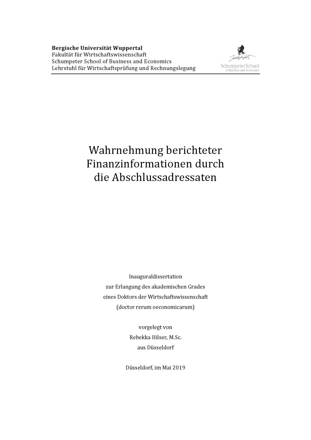 Wahrnehmung berichteter Finanzinformationen durch die Abschlussadressaten / vorgelegt von Rebekka Hilser, M.Sc. aus Düsseldorf