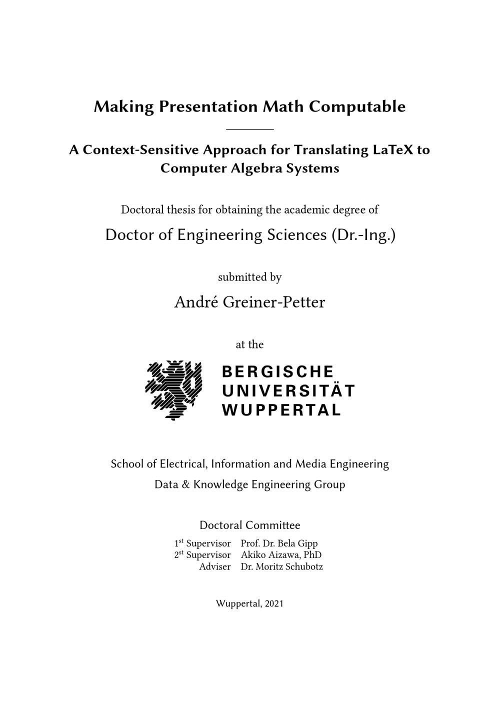 Making presentation math computable : a context-sensitive approach for translating LaTeX to computer algebra systems / submitted by André Greiner-Petter