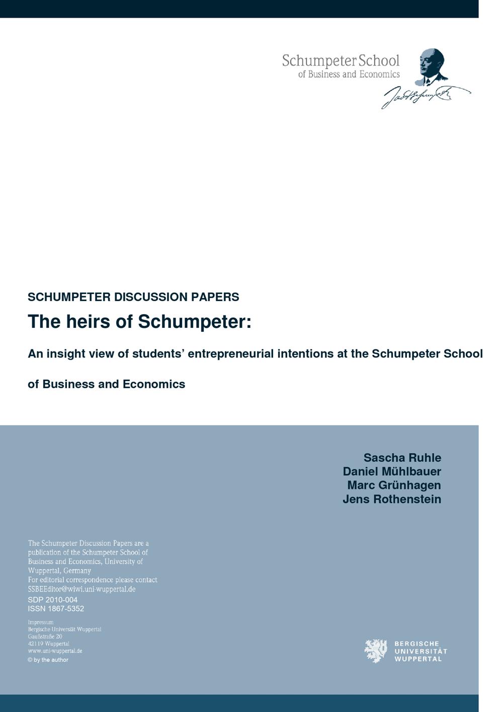 The heirs of Schumpeter : an insight view of students’ entrepreneurial intentions at the Schumpeter School of Business and Economics / Sascha Ruhle ...