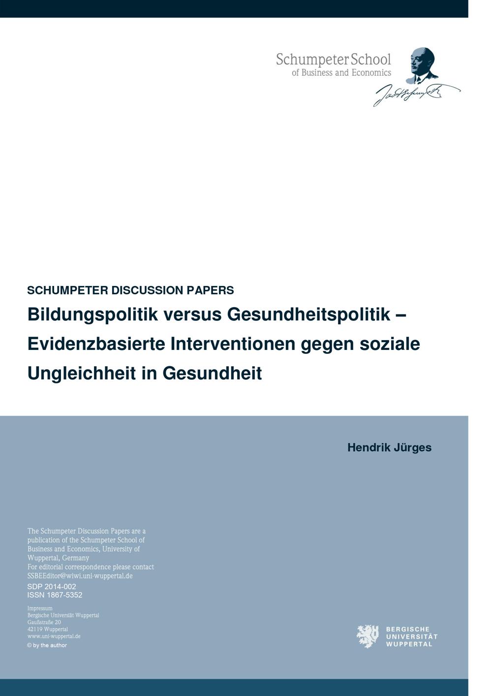 Bildungspolitik versus Gesundheitspolitik : evidenzbasierte Interventionen gegen soziale Ungleichheit in Gesundheit / Hendrik Jürges