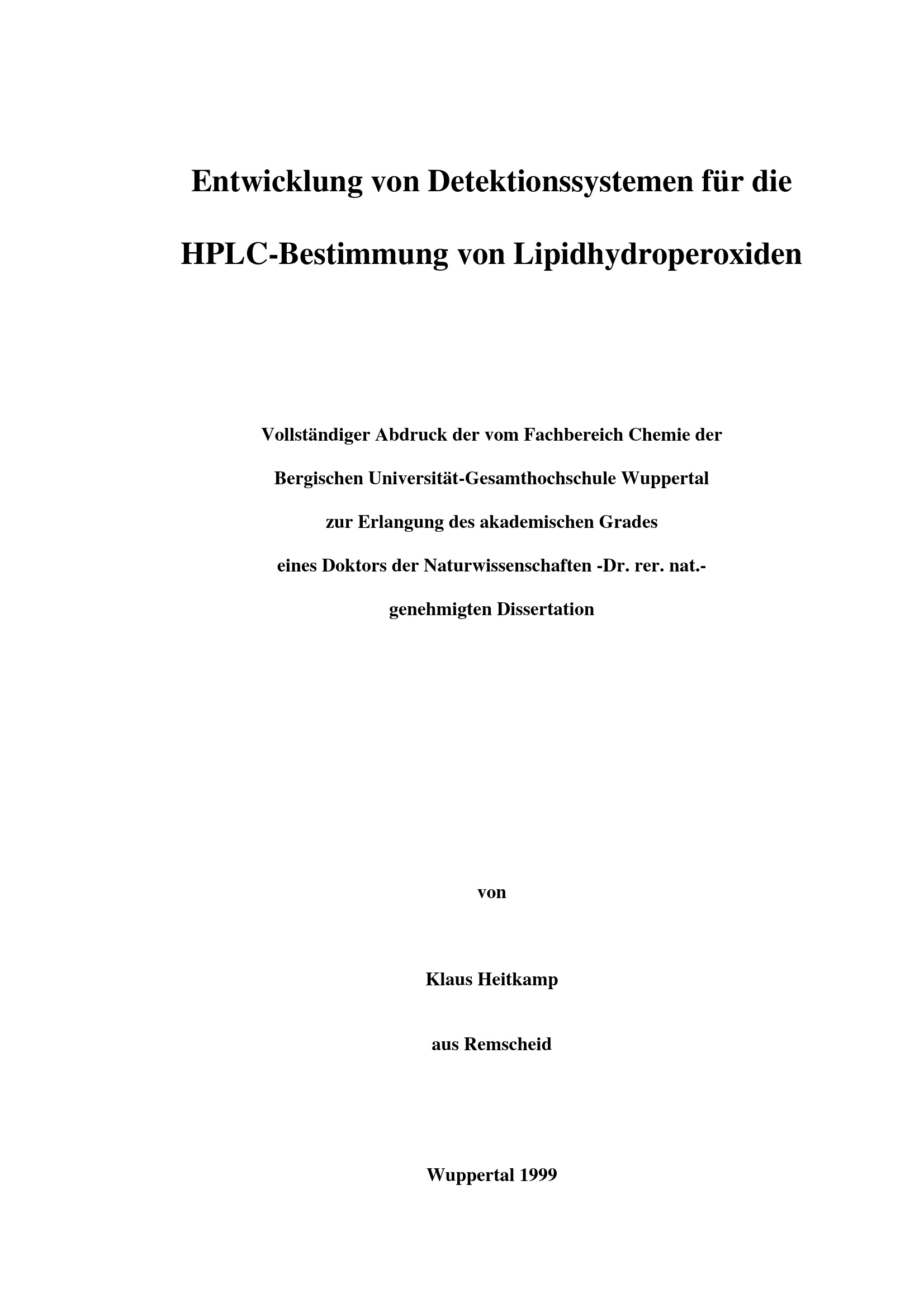 Entwicklung von Detektionssystemen für die HPLC-Bestimmung von Lipidhydroperoxiden / von Klaus Heitkamp