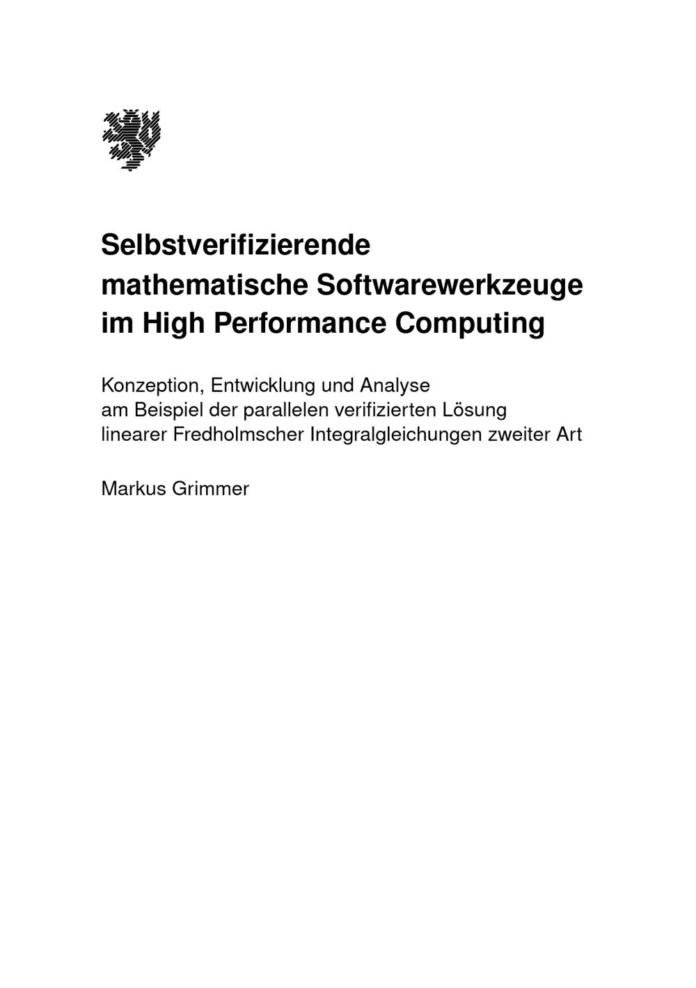 Selbstverifizierende mathematische Softwarewerkzeuge im High Performance Computing : Konzeption, Entwicklung und Analyse am Beispiel der parallelen verifizierten Lösung linearer Fredholmscher Integralgleichungen zweiter Art / Markus Grimmer