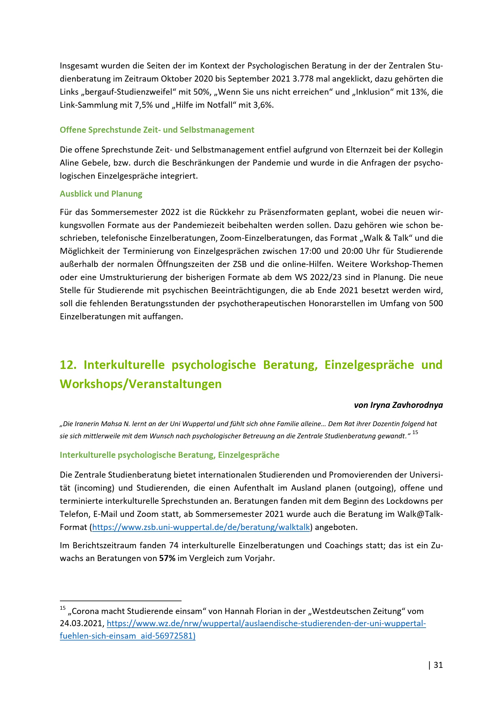 Studium - Pandemie - Beratung: die ZSB im (digitalen) Wandel : 1. Oktober 2020 bis 30. September 2021 / Herausgeber: Zentrale Studienberatung der Bergischen Universität Wuppertal ; Redaktion: Dr. Christine Hummel, Chrissi Kalaitzakis