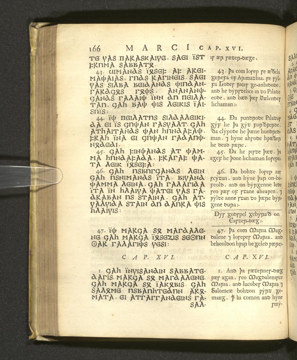 Quatuor D. N. Jesu Christi Euangeliorum Versiones perantiquæ duæ, Gothica scil. et Anglo-Saxonica / Quarum illam ex celeberrimo Codice Argenteo nunc primùm depromsit Franciscus Junius F. F. Hanc autem ex Codicibus Mss. collatis emendatiùs recudi curavit Thomas Mareschallus, Anglus ... Accessit & Glossarium Gothicum cui præmittitur Alphabetum Gothicum, Runicum, &c. operâ ejusdem Francisci Junii