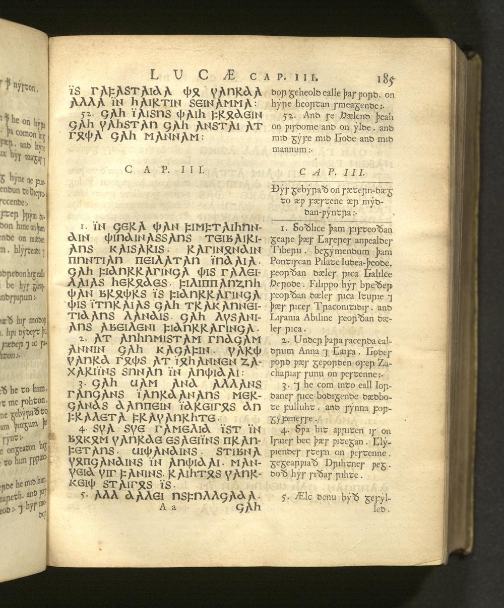 Quatuor D. N. Jesu Christi Euangeliorum Versiones perantiquæ duæ, Gothica scil. et Anglo-Saxonica / Quarum illam ex celeberrimo Codice Argenteo nunc primùm depromsit Franciscus Junius F. F. Hanc autem ex Codicibus Mss. collatis emendatiùs recudi curavit Thomas Mareschallus, Anglus ... Accessit & Glossarium Gothicum cui præmittitur Alphabetum Gothicum, Runicum, &c. operâ ejusdem Francisci Junii