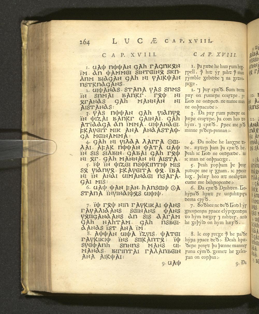 Quatuor D. N. Jesu Christi Euangeliorum Versiones perantiquæ duæ, Gothica scil. et Anglo-Saxonica / Quarum illam ex celeberrimo Codice Argenteo nunc primùm depromsit Franciscus Junius F. F. Hanc autem ex Codicibus Mss. collatis emendatiùs recudi curavit Thomas Mareschallus, Anglus ... Accessit & Glossarium Gothicum cui præmittitur Alphabetum Gothicum, Runicum, &c. operâ ejusdem Francisci Junii