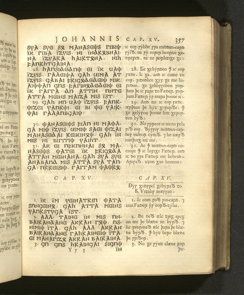 Quatuor D. N. Jesu Christi Euangeliorum Versiones perantiquæ duæ, Gothica scil. et Anglo-Saxonica / Quarum illam ex celeberrimo Codice Argenteo nunc primùm depromsit Franciscus Junius F. F. Hanc autem ex Codicibus Mss. collatis emendatiùs recudi curavit Thomas Mareschallus, Anglus ... Accessit & Glossarium Gothicum cui præmittitur Alphabetum Gothicum, Runicum, &c. operâ ejusdem Francisci Junii