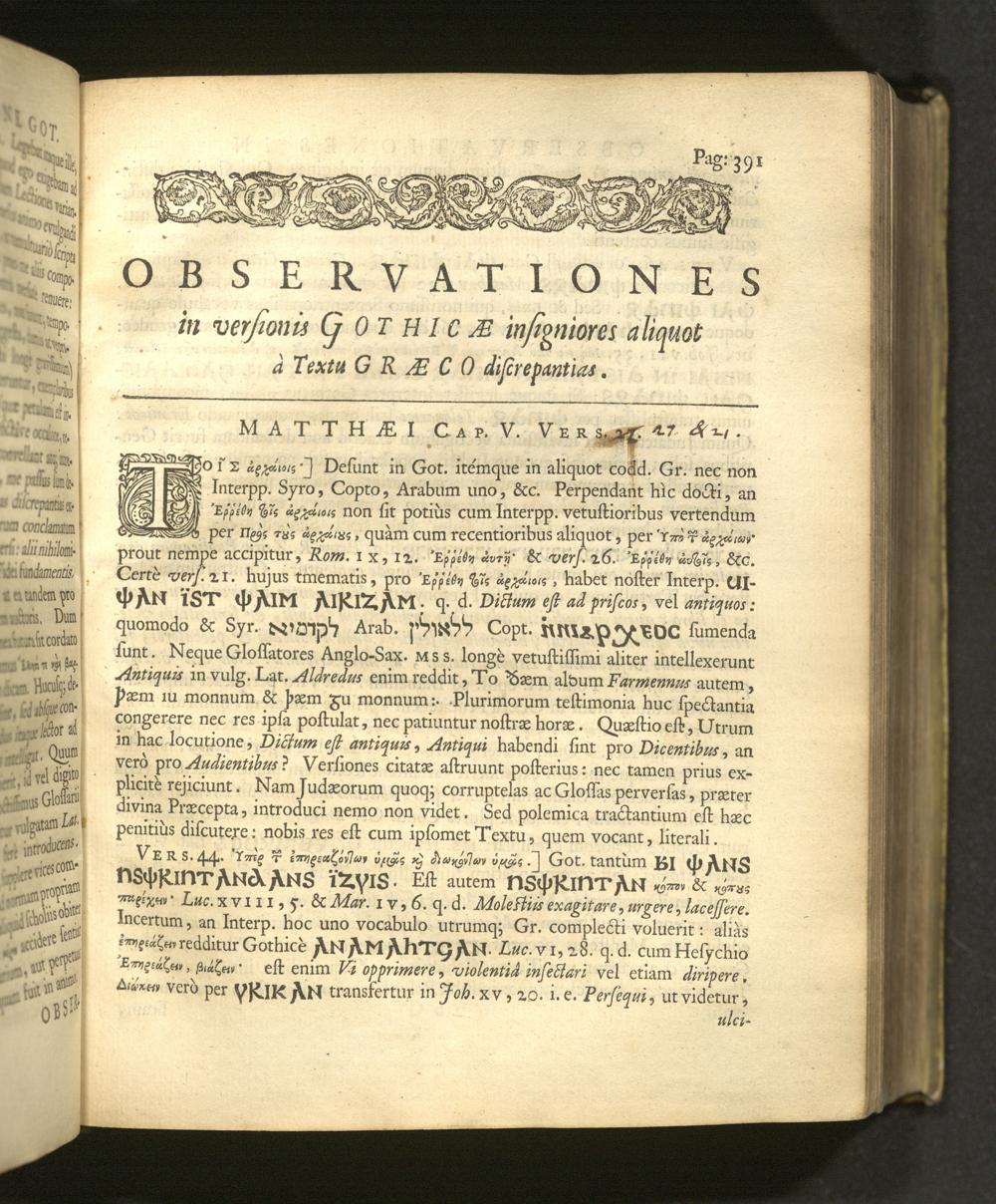 Quatuor D. N. Jesu Christi Euangeliorum Versiones perantiquæ duæ, Gothica scil. et Anglo-Saxonica / Quarum illam ex celeberrimo Codice Argenteo nunc primùm depromsit Franciscus Junius F. F. Hanc autem ex Codicibus Mss. collatis emendatiùs recudi curavit Thomas Mareschallus, Anglus ... Accessit & Glossarium Gothicum cui præmittitur Alphabetum Gothicum, Runicum, &c. operâ ejusdem Francisci Junii