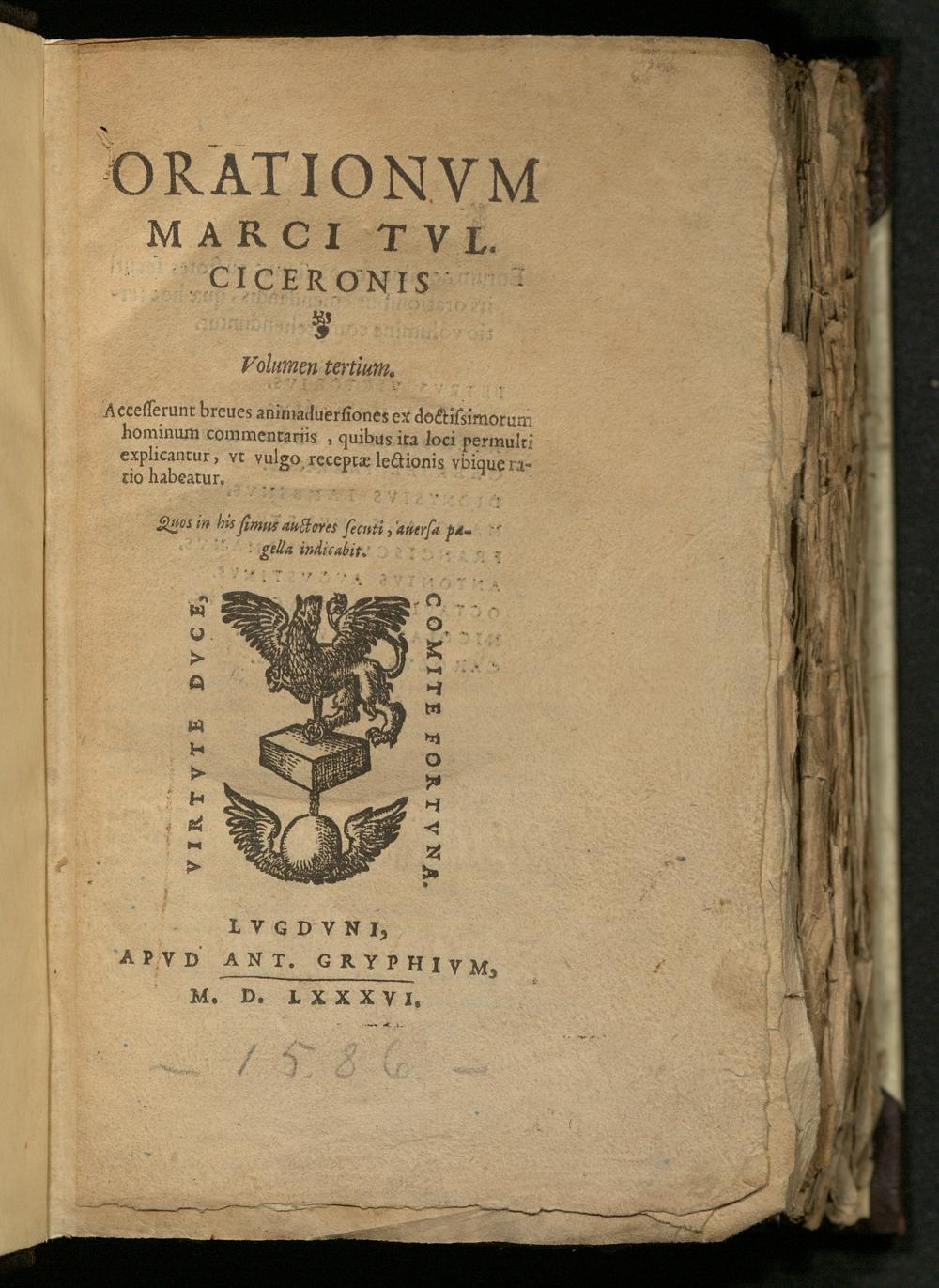 3 (1586) Orationvm Marci Tvl. Ciceronis : Accesserunt breues animaduersiones ex doctissimorum hominum commentariis, quibus ita loci permulti explicantur, vt vulgo receptæ lectionis vbique ratio habeatur