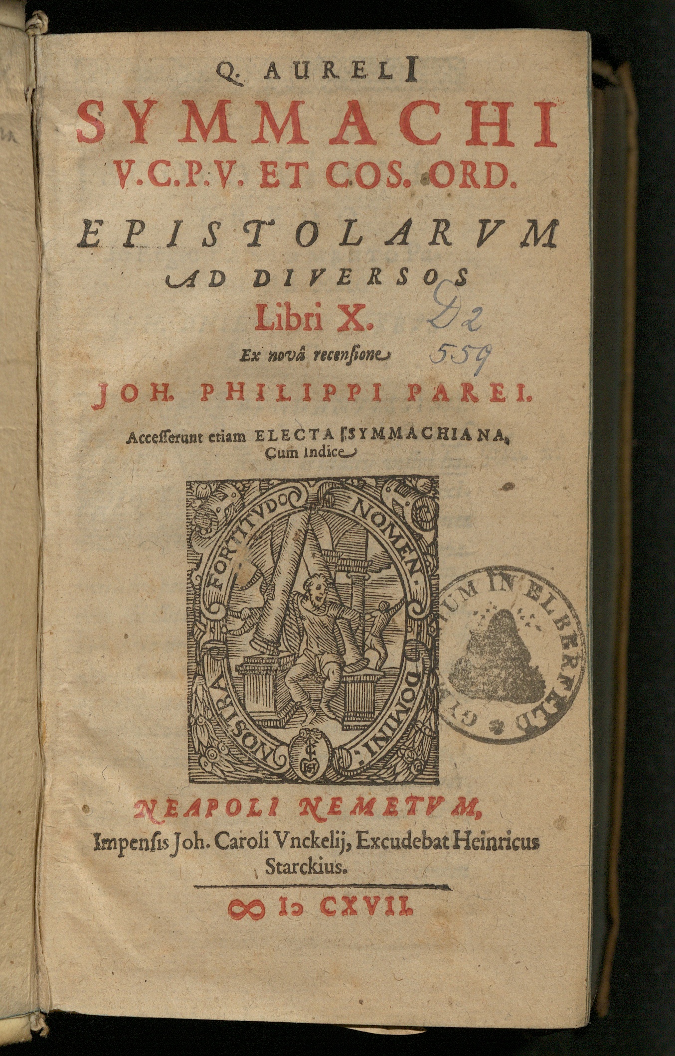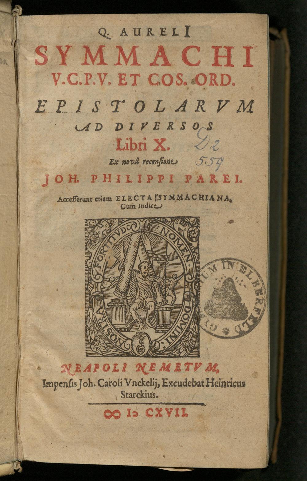 Q. Aureli[i] Symmachi V.C.P.V. Et Cos. Ord. Epistolarvm Ad Diversos Libri X. / Ex novâ recensione Joh. Philippi Parei