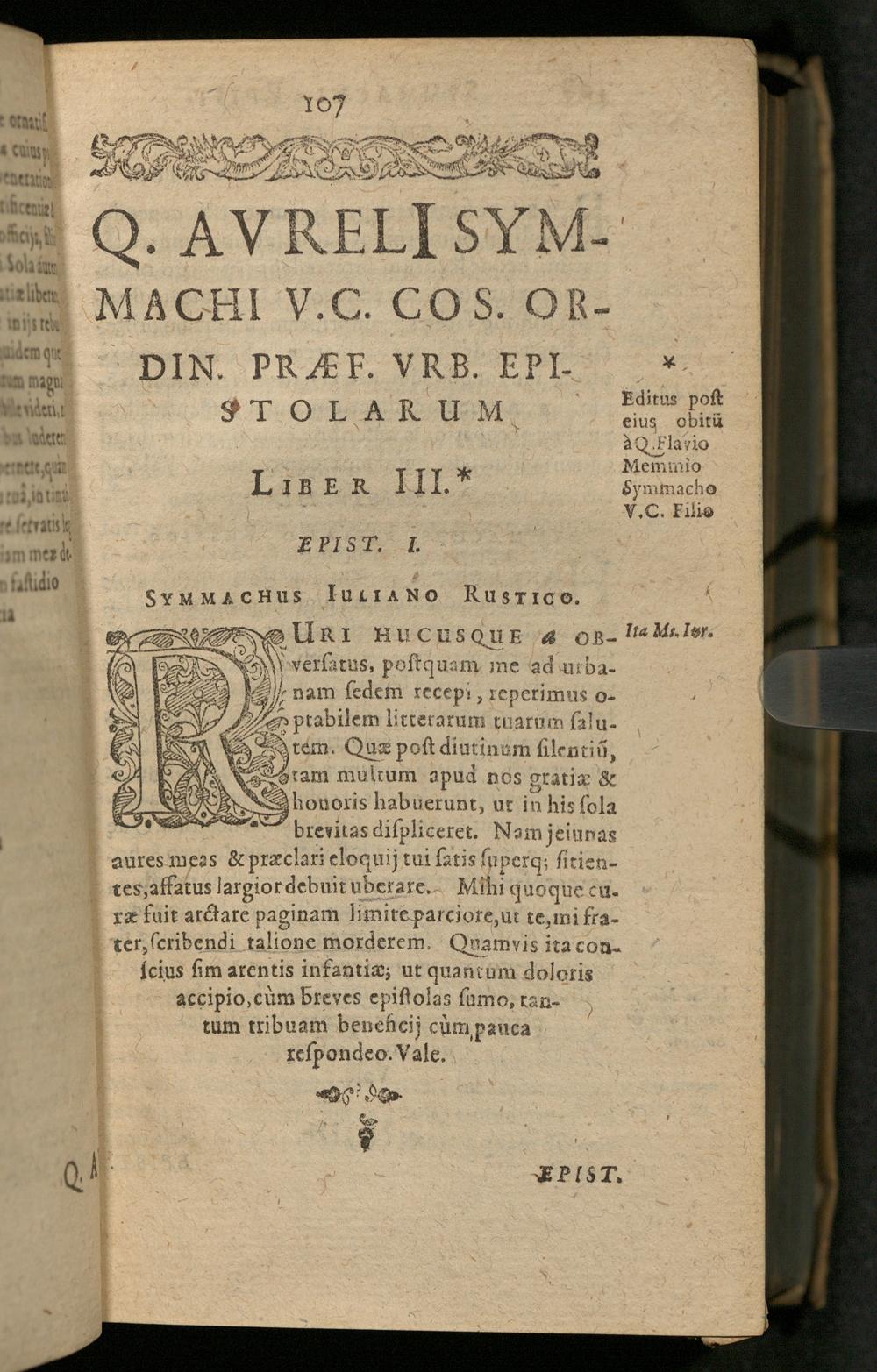 Q. Aureli[i] Symmachi V.C.P.V. Et Cos. Ord. Epistolarvm Ad Diversos Libri X. / Ex novâ recensione Joh. Philippi Parei