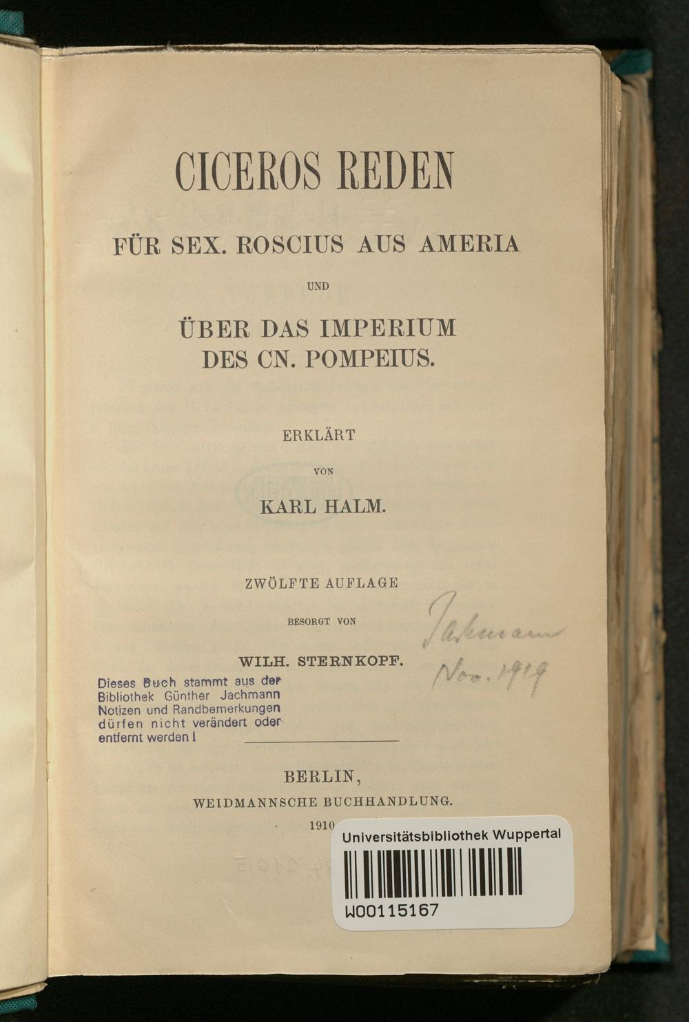 1 (1910) Ciceros Reden für Sex. Roscius aus Ameria und über das Imperium des Cn. Pompeius / erklärt von Karl Halm