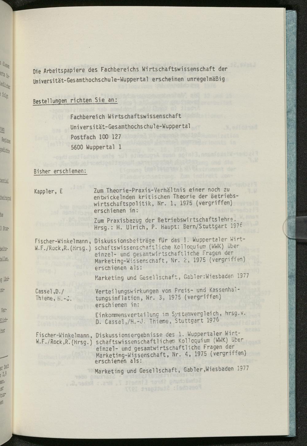 Bibliographie der bisher erschienenen Arbeitspapiere