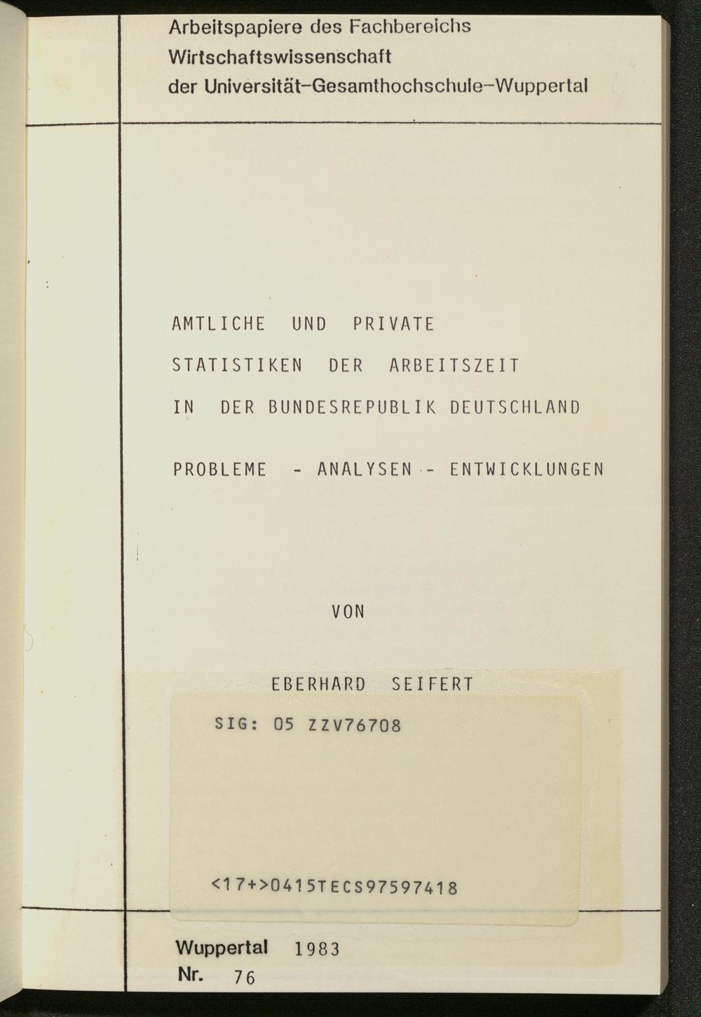 Amtliche und private Statistiken der Arbeitszeit in der Bundesrepublik Deutschland : Probleme, Analysen, Entwicklungen / von Eberhard Seifert