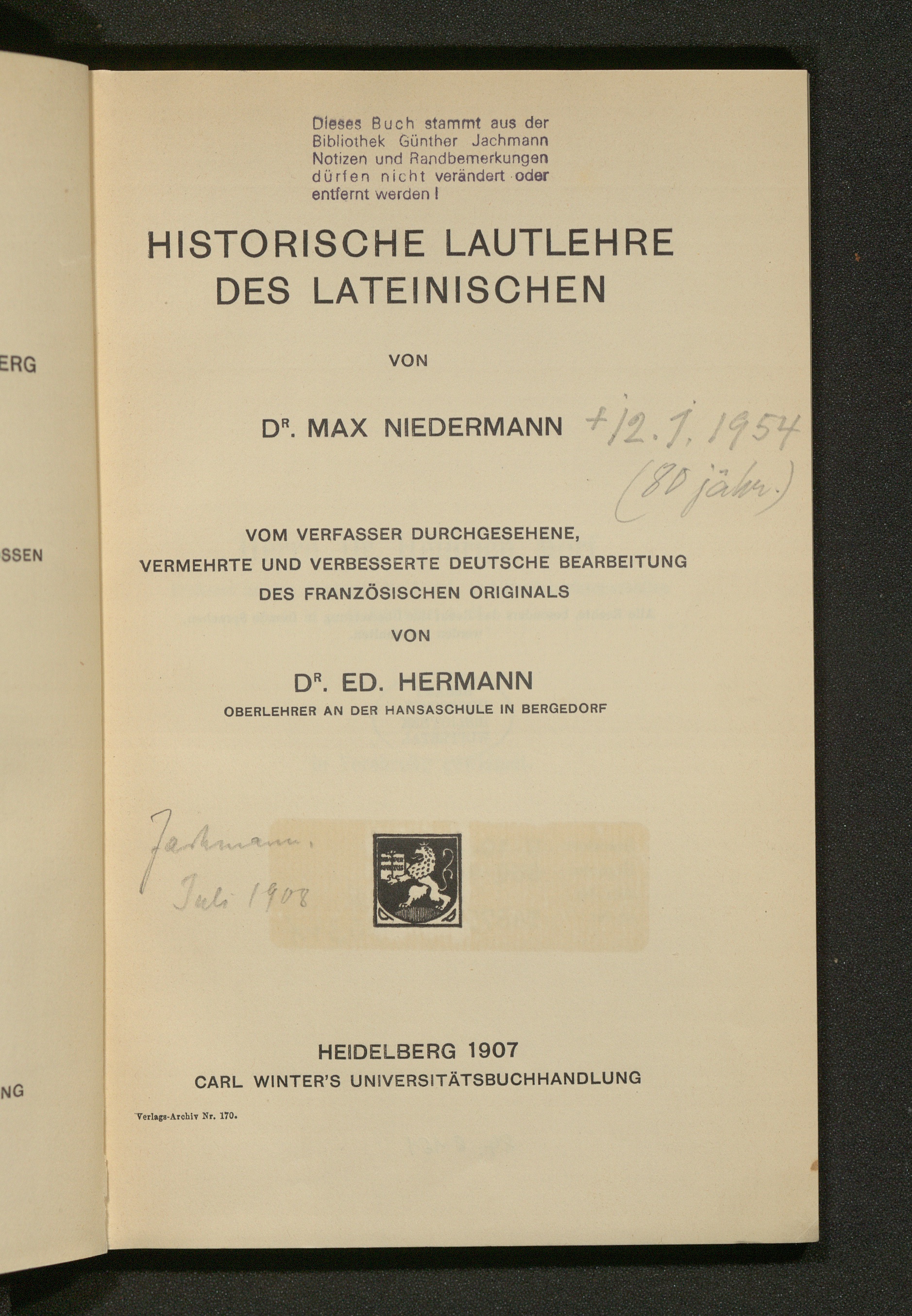 Historische Lautlehre des Lateinischen / von Max Niedermann. Vom Verf. durchges., verm. und verb. dt. Bearb. des franz. Orig. von Ed. Hermann